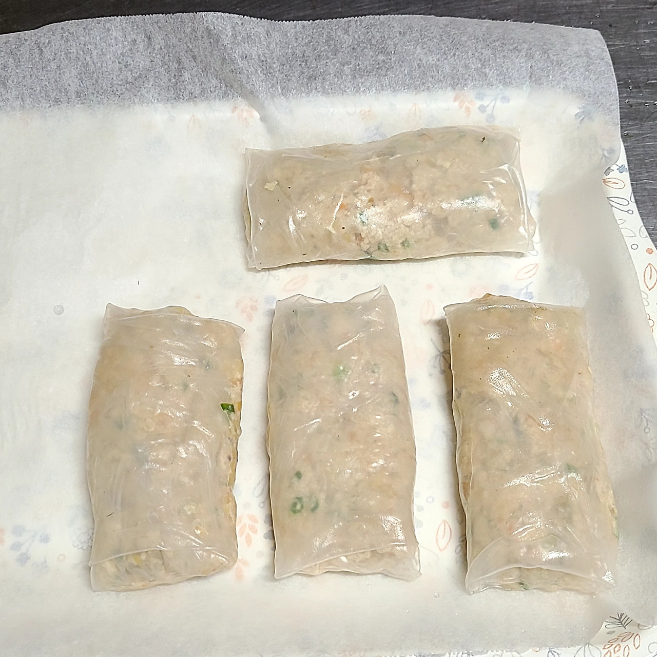 월남쌈 페이퍼를 찬물에 적셔 남아있던 만두소를 넣고 돌돌 말아주었다.
