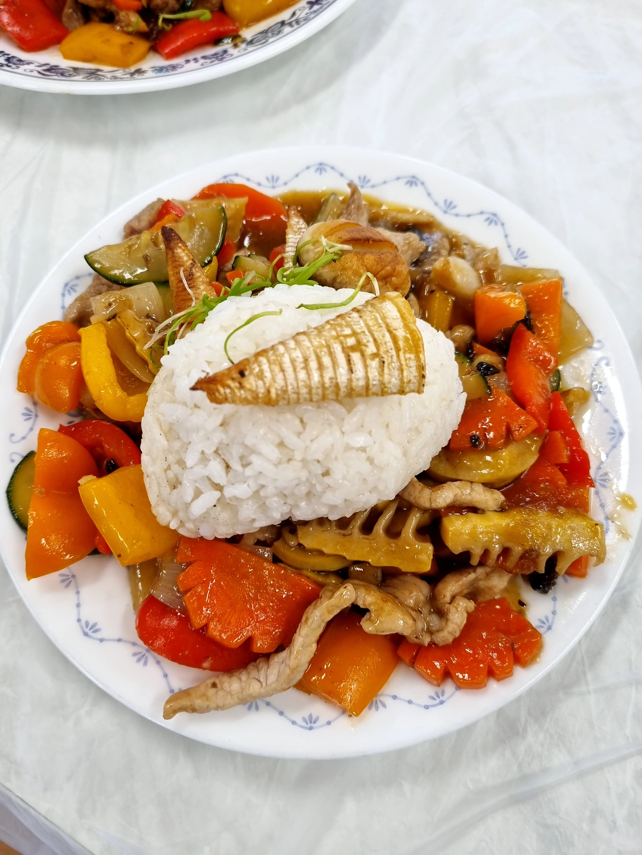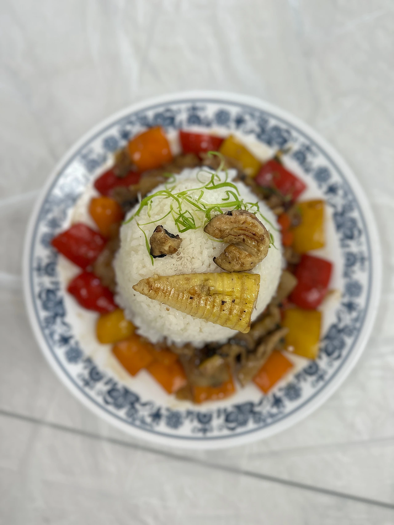 휴대용 가스레인지에 웍을 올리고 뜨겁게 달군 후 기름을 넉넉히 둘러, 불을 줄이고 총총 썰어둔 대파 하얀 부분을 볶는다. 마늘을 넣어 볶은 후 불을 강하게 올려 돼지고기를 넣고, 양파, 당근과 주키니를 먼저 볶고 브로콜리와 파프리카를 넣어 볶는다. 간장, 설탕, 후추, 굴소스를 넣어 볶은 후 물을 한 컵 넣어 끓인다. 여기에 전분을 푼 물을 부어 걸쭉하게 만들어준 후 불을 끄고 참기름과 갈아놓은 깨를 넣어 마무리한다.
