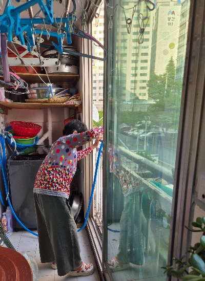 “내가 넘어가서 받을랑게. 넘기바.”라고 하시더니 베란다 커다란 통창을 열고 에어컨 실외기가 설치된 곳을 가리킵니다.