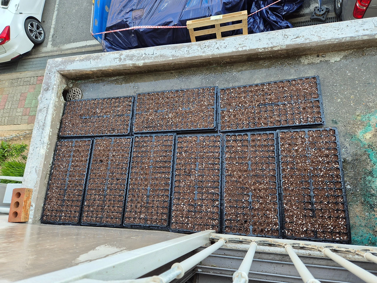 종묘판 10개를 아슬아슬한 아파트 입구 처마 위에 펼치고 다시 베란다로 넘어오시더니, “고맙네.”라며 항상 그랬던 것처럼, 물주는 호스를 들고 수도꼭지를 돌려 종묘 판에 물을 주고 있습니다.