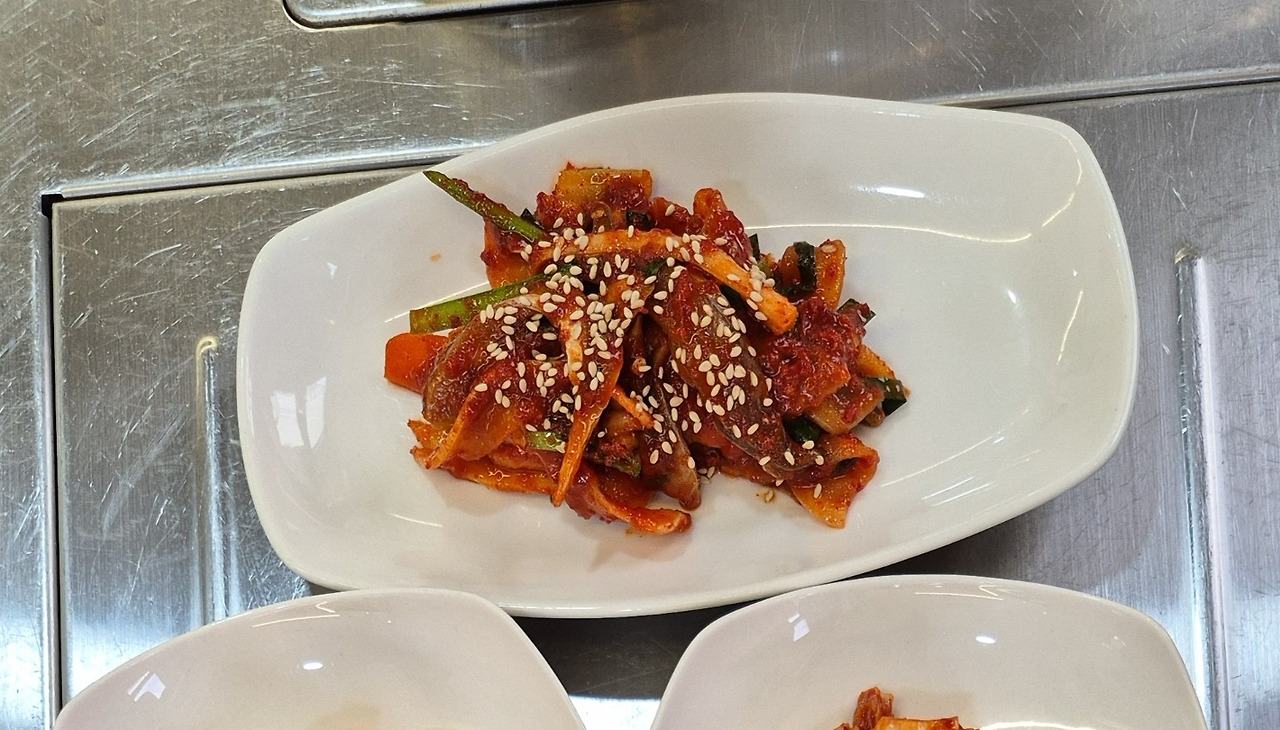 “요거도 먹어봐. 간재미 무침.”이라며 간재미와 무, 당근, 양파, 부추가 들어가 새콤달콤 무쳐진 간재미 무침을 제 앞으로 끌어다 줬습니다.