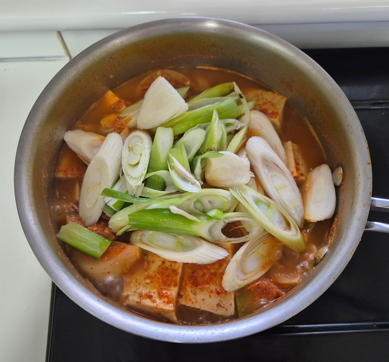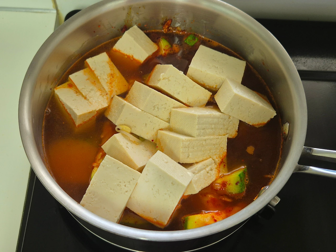 - 뚜껑을 덮고 센 불에서 끓이다가 끓기 시작하면 두부를 넣는다.