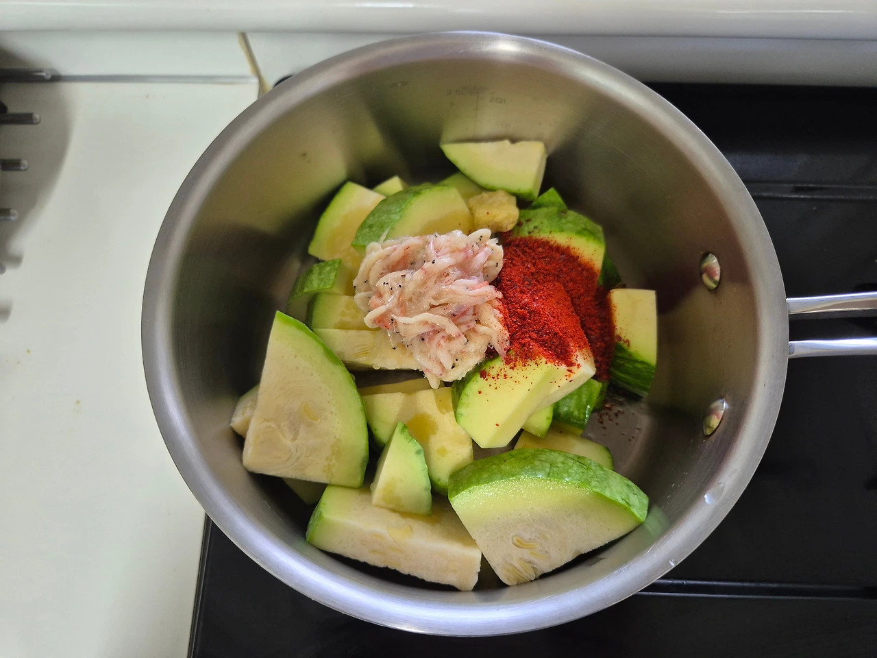 - 냄비에 조선호박과 다진 마늘 2T와 생강 1t을 넣고 새우젓과 고춧가루 그리고 감칠맛을 위해 맛 간장 조금을 넣고 약한 불에서 볶아준다.