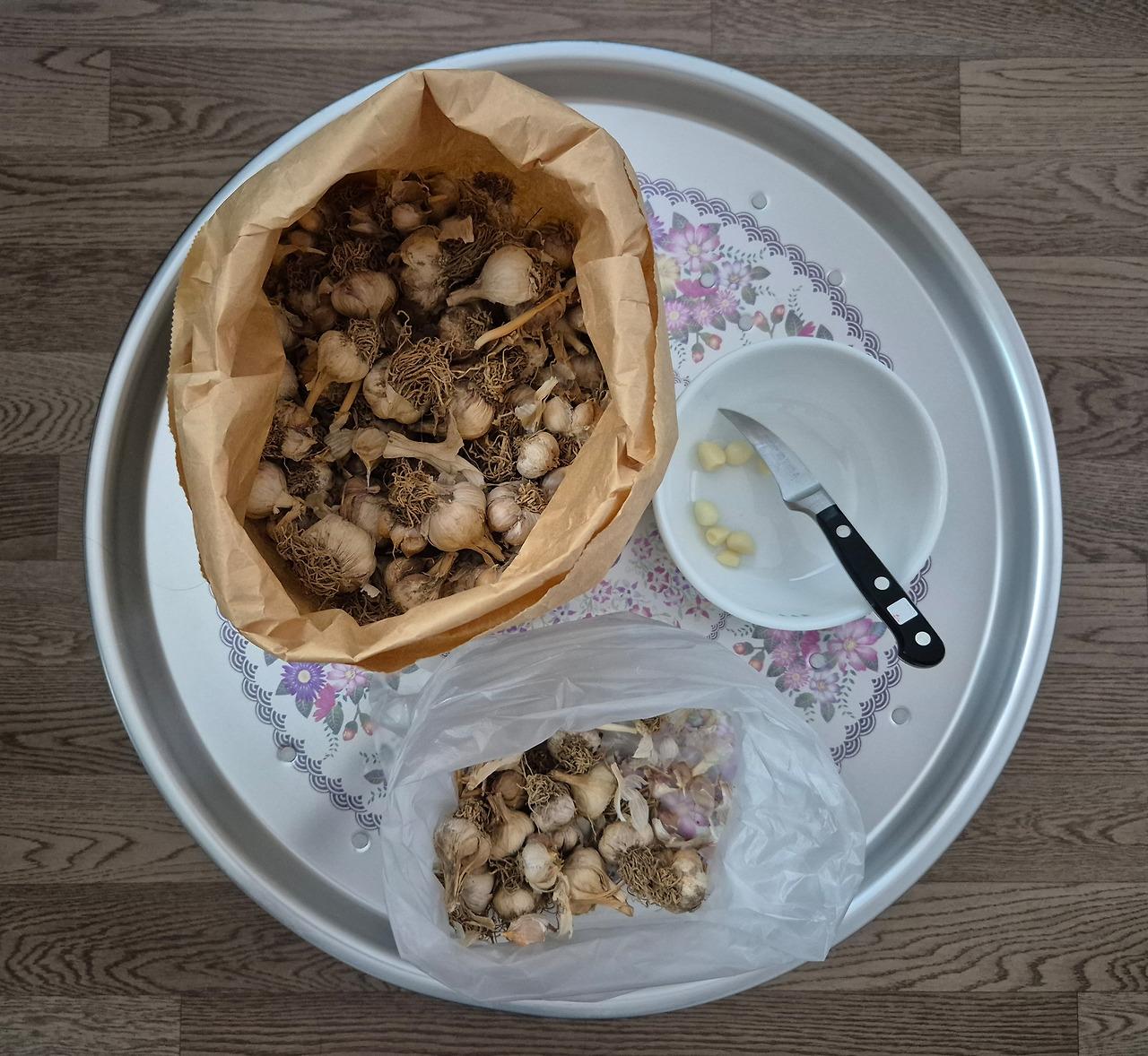 오봉 밥상에 껍질 버릴 비닐봉지와 깐 마늘을 담을 그릇을 올려놓고 심호흡하고 한 알 한 알 까기 시작했지요.