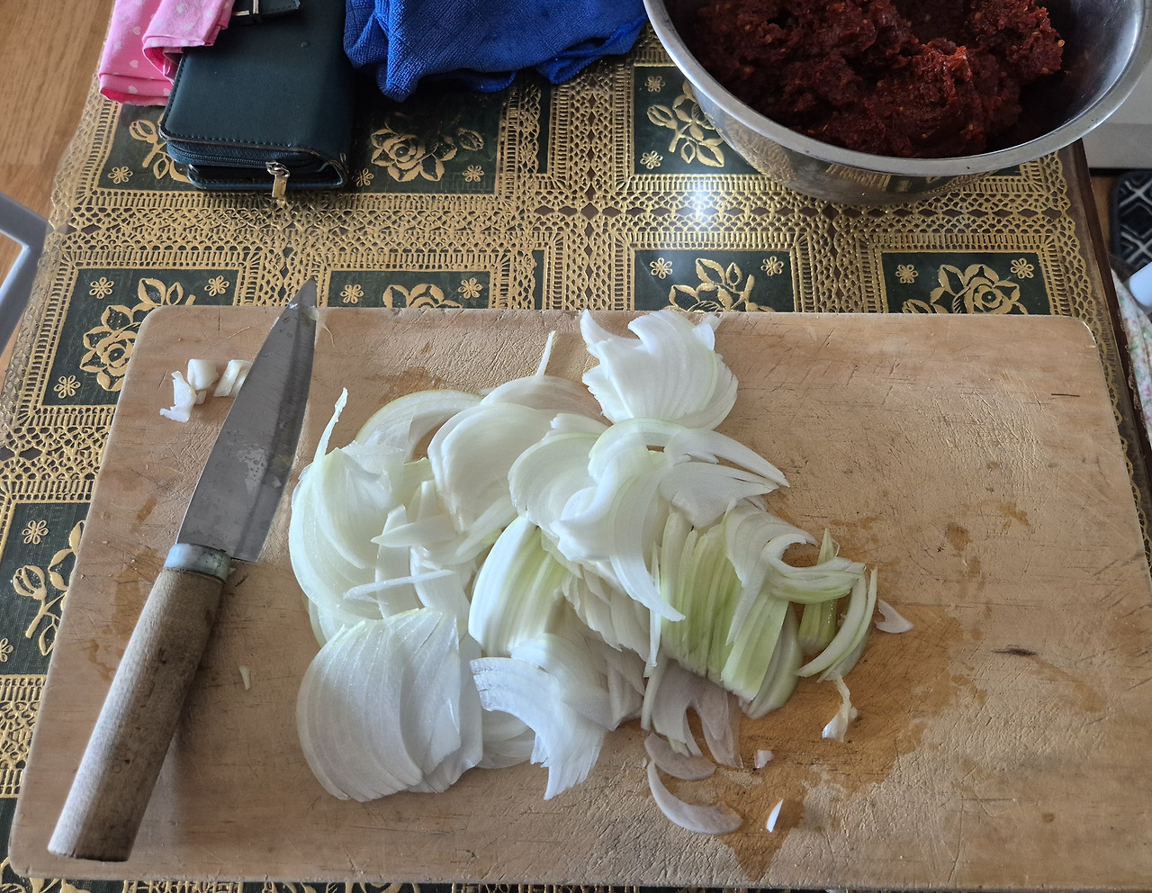 양파를 채를 써는 동안 할머니가 무심히 김치 담고 남았던 양념장이 들어있는 반찬통을 내 앞에 놓고 베란다로 가셨다.