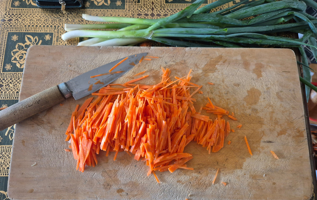 채 썬 당근을 양푼에 넣자 “당근을 다 썰었다냐. 많은디.”라며 괜스레 고생했다고 하셨다.