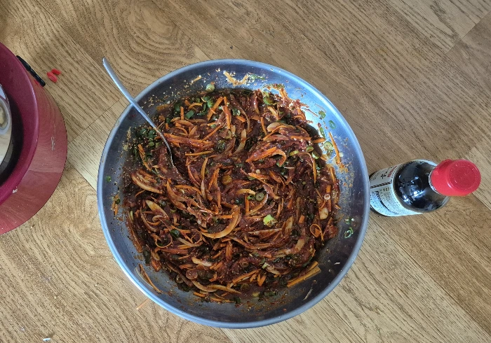양념에 내가 채 썬 양파와 당근 그리고 총총 썬 대파를 넣어 깻잎지에 넣을 양념을 완성.