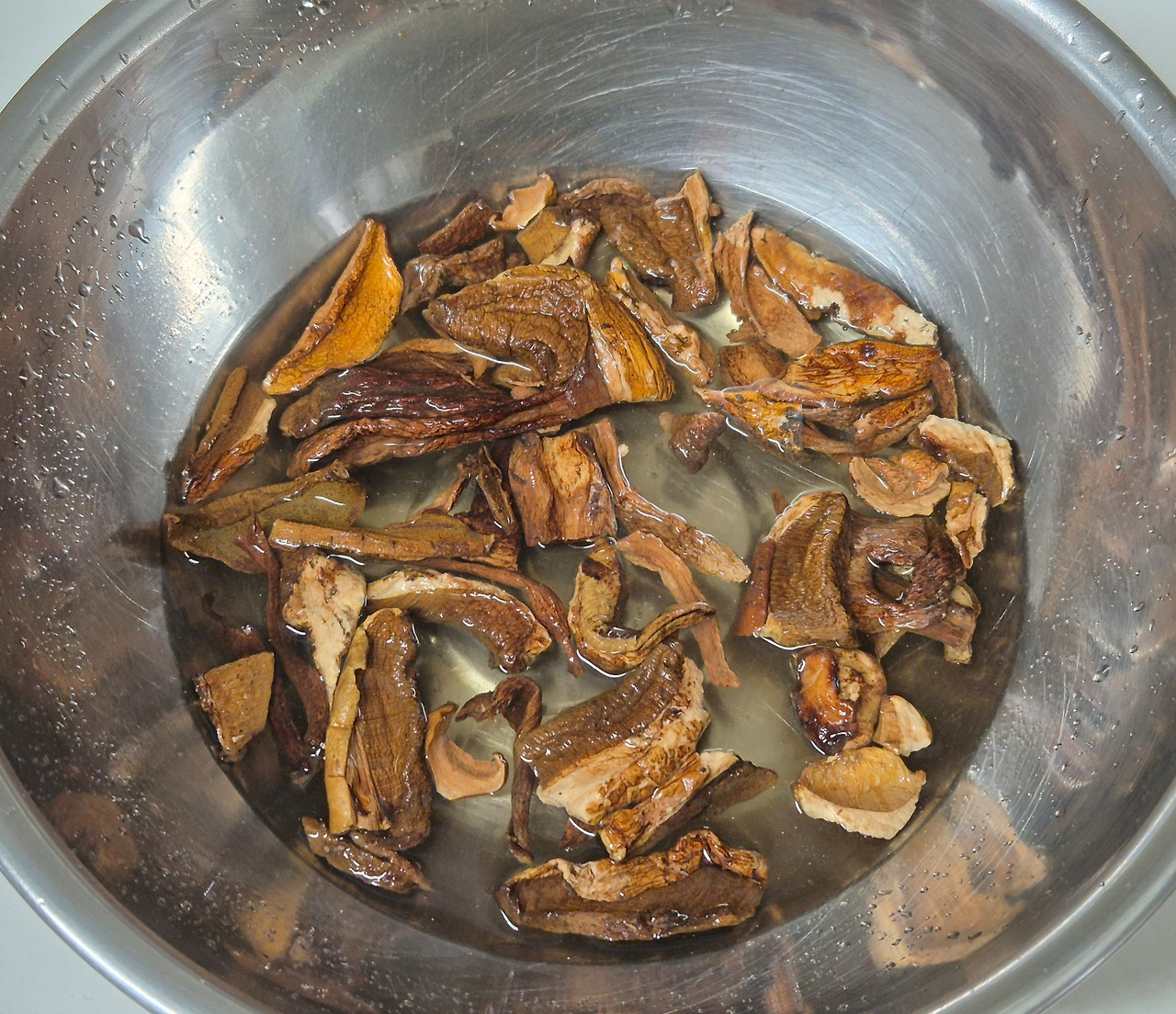 냉동실에서 꺼낸 말린 포르치니 버섯을 물에 헹궈 혹시나 있을지도 모를 이물질을 제거한다. 물에 담가 한 15분 정도 불린다.