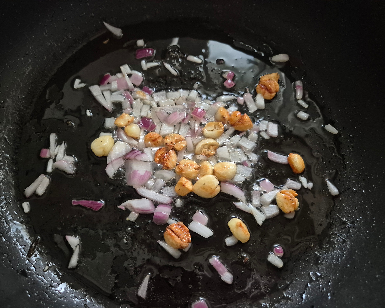 새끼손톱만 한 마늘을 칼 등으로 내리쳐 준비하고 적 양파는 다져 놓는다.