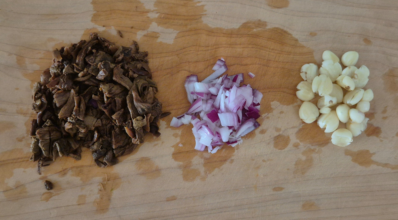 불린 포르치니를 건져내 물기를 꼭 짜준 후 너무 작지 않게 다지듯 썰어준다. 불린 포르치니가 들어있던 검은 물은 한쪽에 놓아둔다.