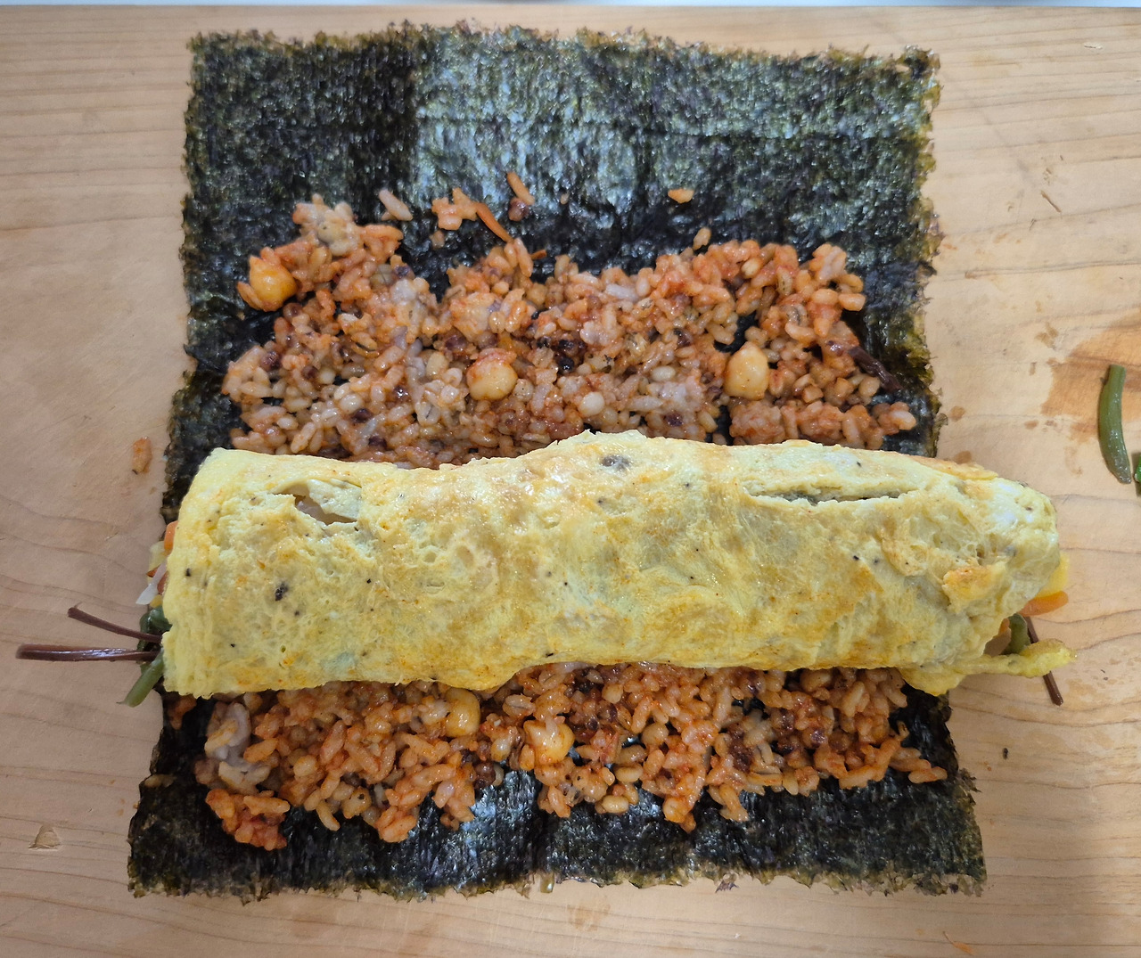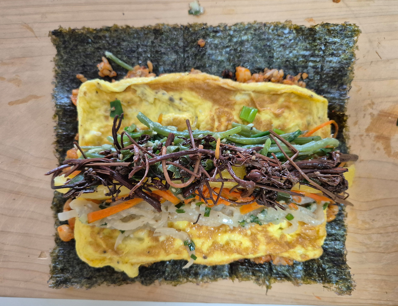무나물, 고비나물 그리고 고구마 줄기 나물, 볶은 당근 그리고 단무지를 말은 달걀지단을 밥이 올려진 김으로 꼭꼭 눌러 말아줍니다.