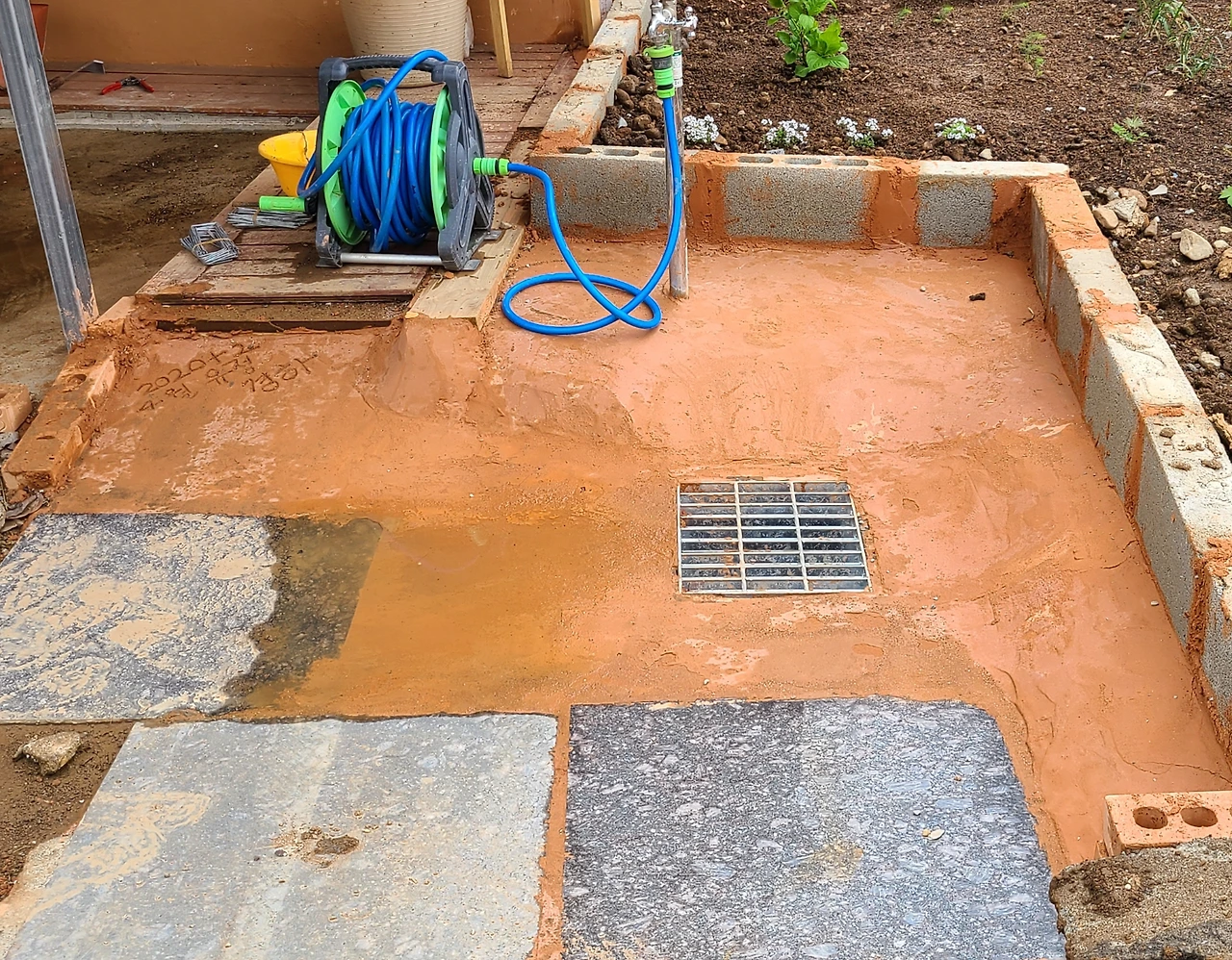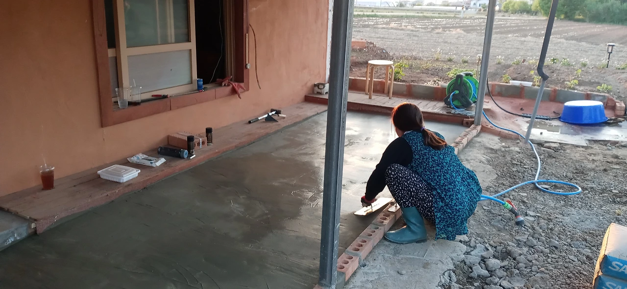 연습 삼아 몰탈을 개어, 잔디 심을 마당과