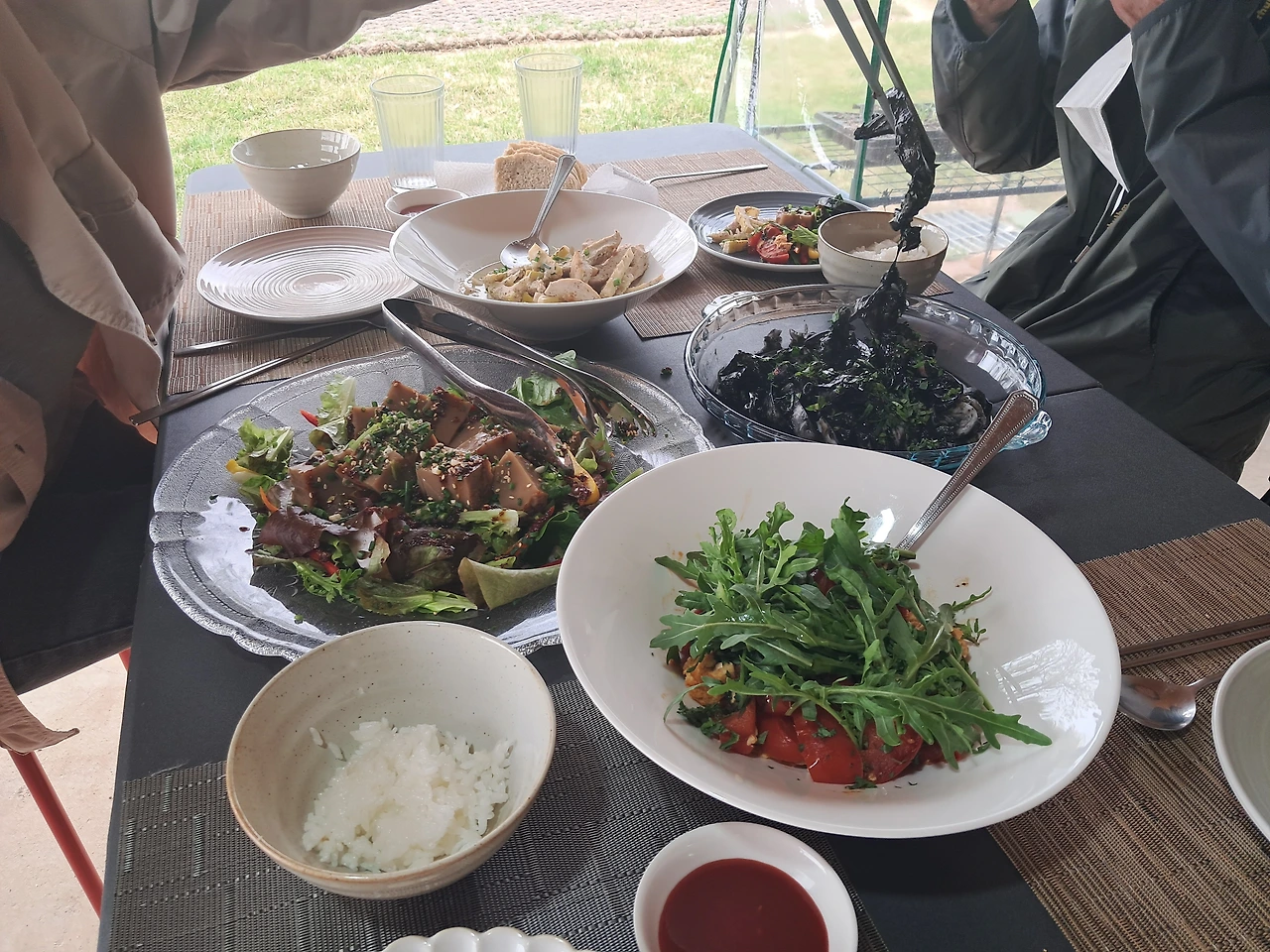 씻고 나가서 채소 따고 정리해서 포장까지 하려면 한 한 시간, 요리 한 시간, 그동안 두부가 상차림 준비하고오오오 아! 청소.