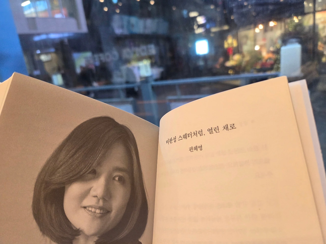 편혜영 작가의 '초록 스웨터'는 경주가 돌아가신 어머니가 남긴 스웨터를 다른 사람들의 도움을 받아가며 완성해나가며 어머니의 인생의 여정을 따라가보는 내용입니다. 다양한 사람이 그 스웨터를 떠주지만 다시 인연이 끊어지고 다시 새로운 사람이 떠주며 그들과 친밀한 관계를 이어가게 되는데요 마지막에 어머니의 절친한 친구 영주 이모와 오백만원을 떼먹고 잠적한 어머니의 또다른 친구인 나주 이모를 만나러 강화도에 떠나게 되는데요 어머니의 소원이었던 장소에서 어머니의 어릴 적 친구들과 어머니에 대한 회상을 하며 어머니를 진정 마음속에서 떠나보내게 됩니다