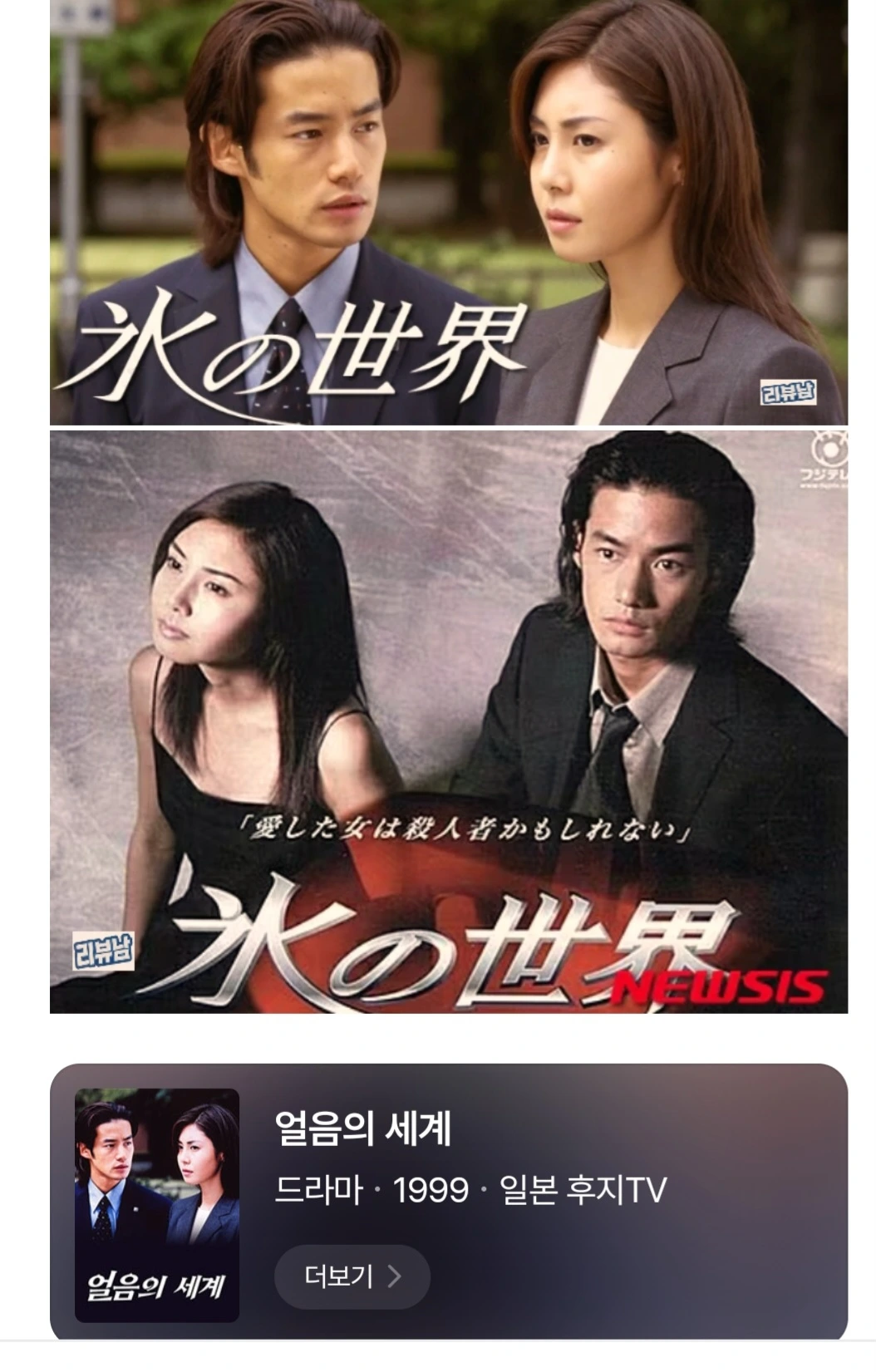 일본 당대 최고의 흥행력과 미모를 자랑하는 배우 '마츠시마 나나코'와 미남 배우의 대명사 ' 타케노우치 유타카'가 주연하고 미스테리멜로물의 거장 노자와 히사시 각본의 아주 유명한 작품인데요 올해 박민영 위하준 주연의 '세이렌'이라는 작품으로 리메이크 된다고 해요