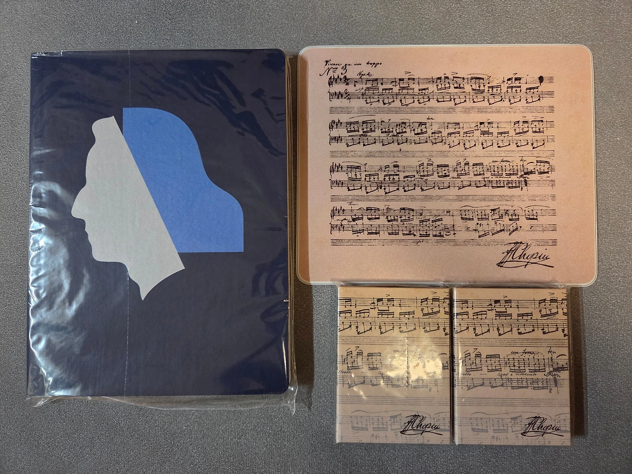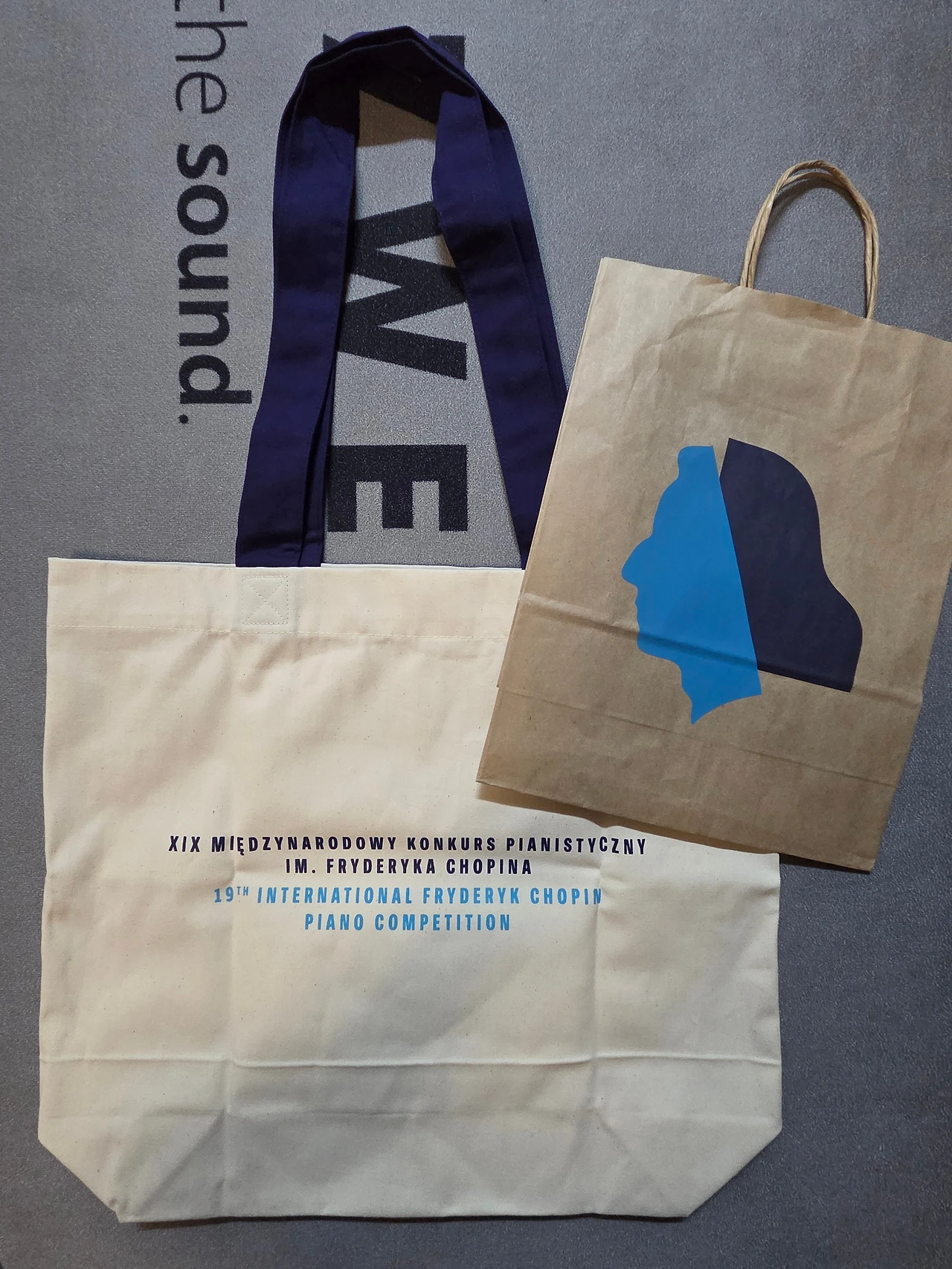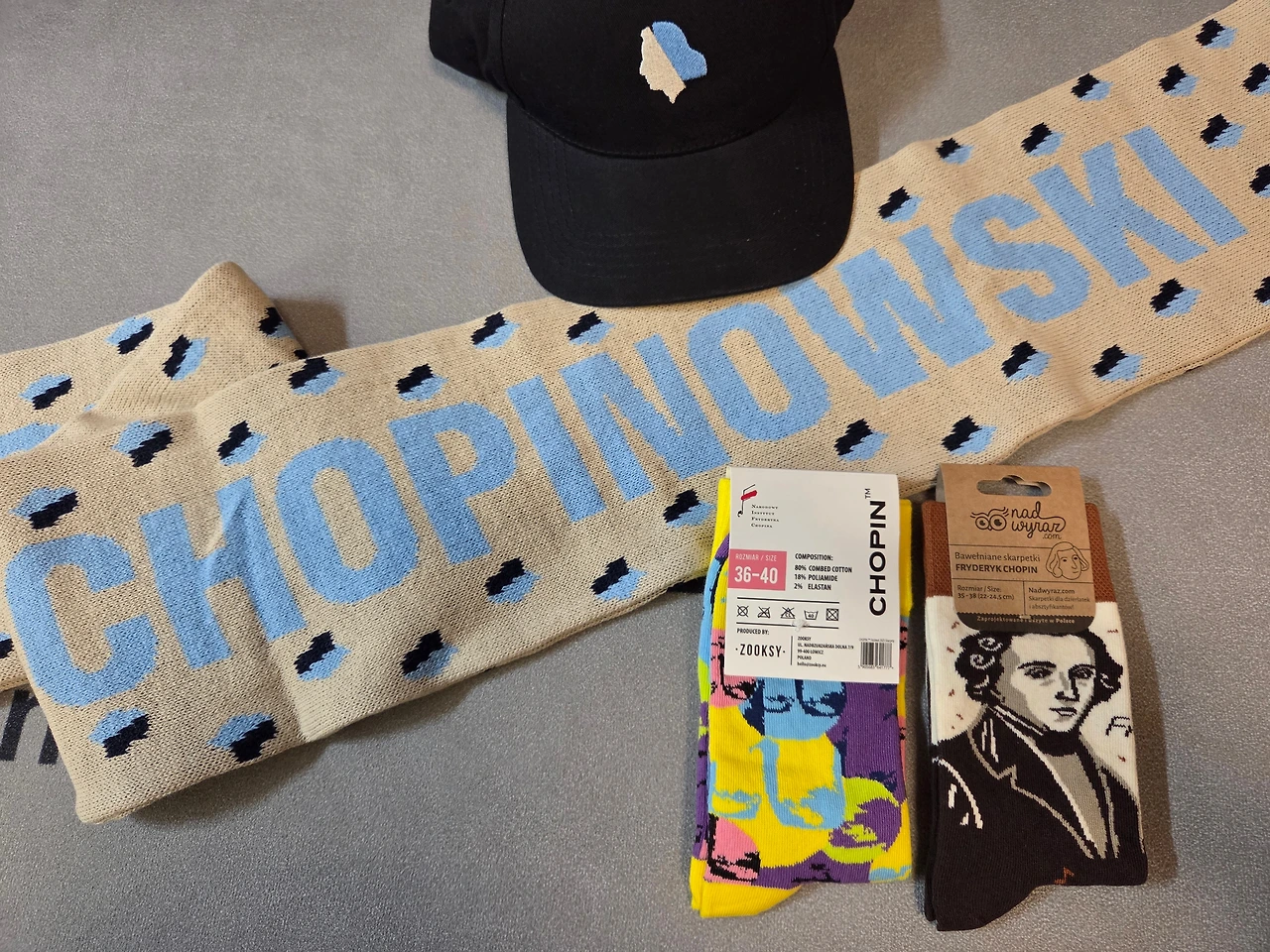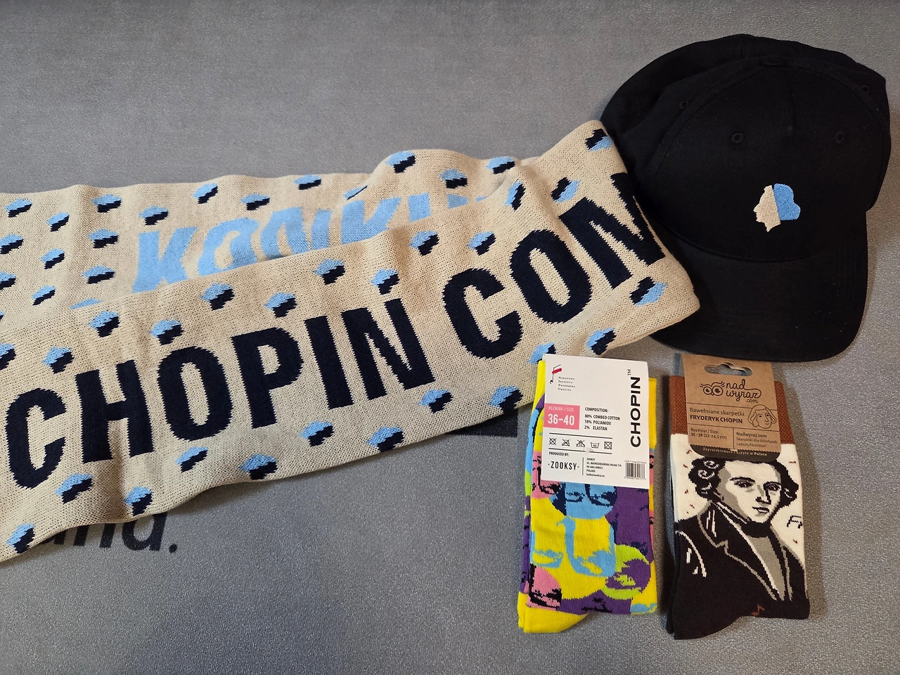 로고를 전면에 넣은 모자와, 로고와 함께 양면에 '쇼팽 콩쿠르'가 영어와 폴란드어로 들어가 있는 슬로건 타월도 구입했다. 쇼팽의 얼굴이 발에 놓이도록 착용하지는 못할 것 같지만 소장용으로 양말도 담았다. 그 밖의 문구류로는 큰 노트, 쇼팽의 서명과 에튜드 Op.10 No.3 - '이별의 곡'으로 알려져 있다 - 악보로 만들어진 작은 수첩, 마우스 패드를 골랐다.