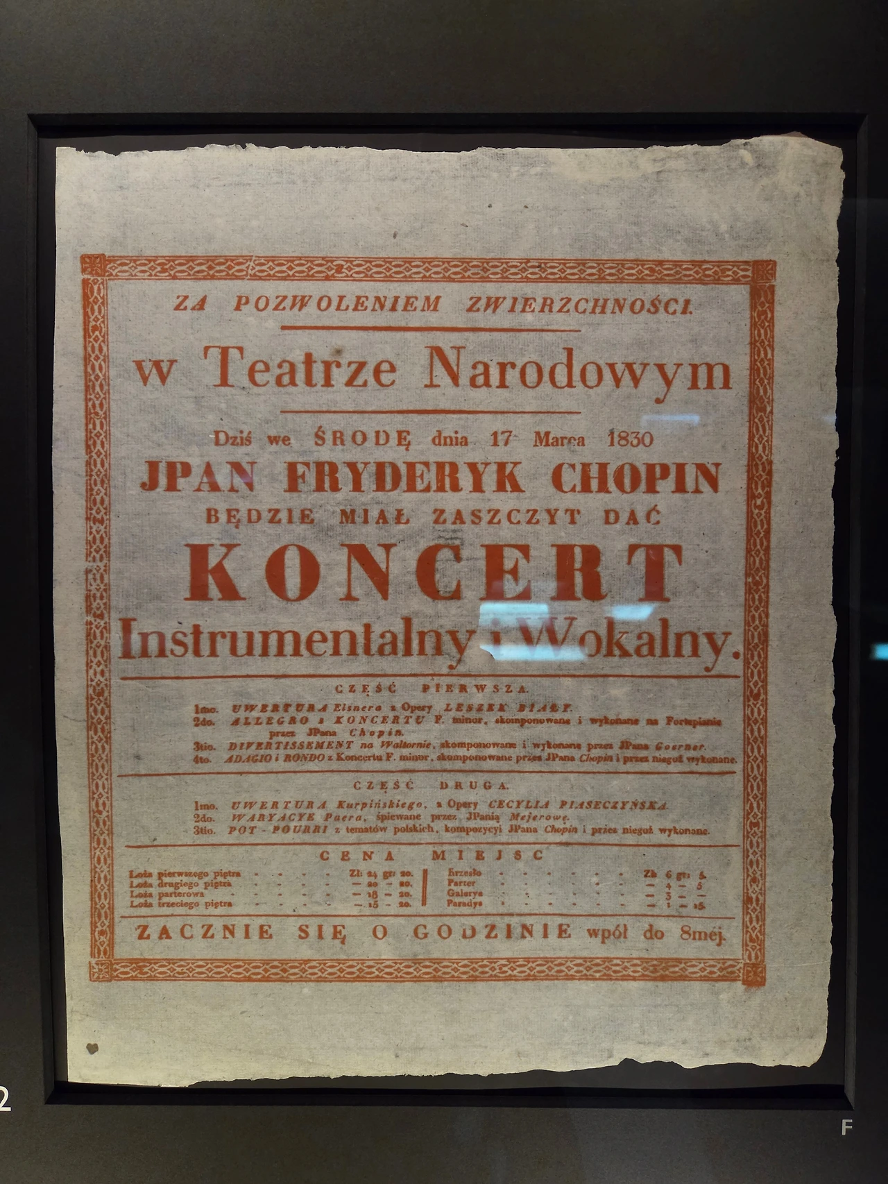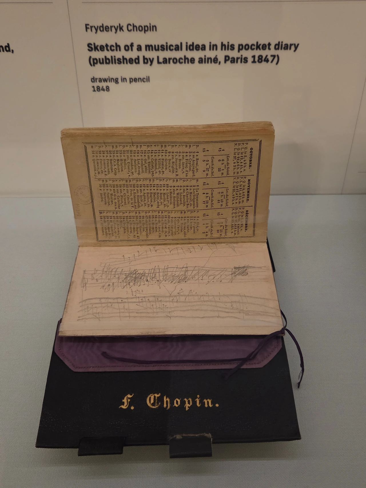 쇼팽이 위대한 작품들을 창조한 흔적, 악보들도 관람할 수 있었다. 드문드문 연습하면서 손가락은 모터처럼 움직여주기를 바라는 에튜드 Op.10 No.12(혁명) 악보도 볼 수 있었다. 밝고 튼튼한 종이 악보를 보며 연습했던 곡인데 친필 악보를 보게 되니 1800년대의 쇼팽과 2025년의 우리가 음악으로 연결될 수 있다는 사실에 신비롭기까지 했다. 뿐만 아니라 젊은 쇼팽을 응원하고 지원했던 이들이 쇼팽에게 마음을 담아 주었던 물품과 쇼팽의 연주회 포스터 등도 전시되어 있었다. 이렇게 쇼팽박물관에는 쇼팽과 쇼팽의 음악에 영향을 주었던, 쇼팽을 둘러싼 모든 존재들의 서사가 있었다. 쇼팽의 삶과 그가 살았던 시공간에 대해 더 많이 살펴본 후에 또다시 방문해보고 싶다.