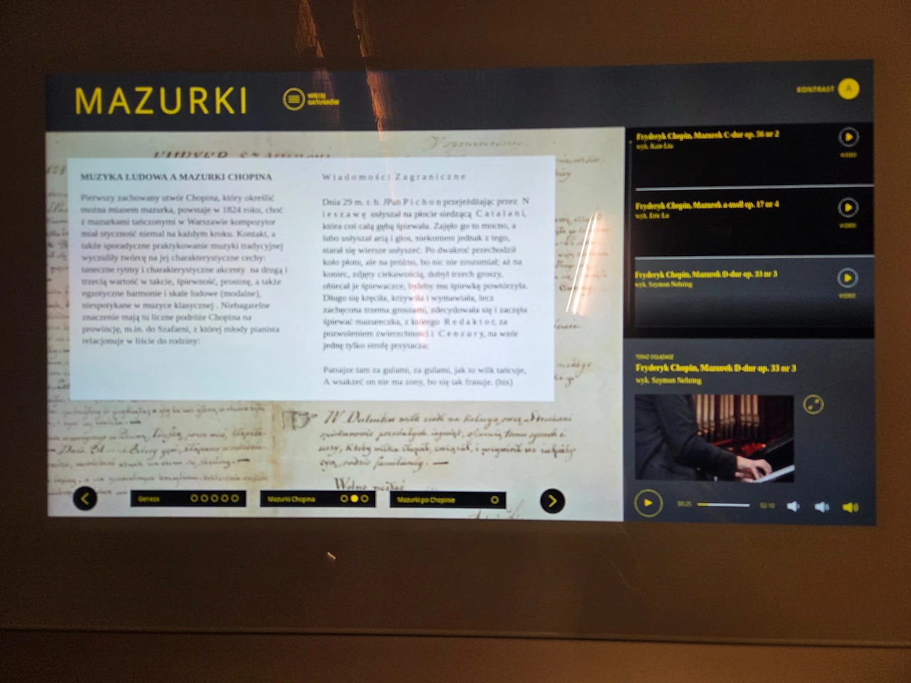 쇼팽의 일대기 연표가 전시된 공간을 지나 쇼팽의 작품을 들어볼 수 있는 공간에 들어섰다. 선택한 쇼팽 작품을 관련 정보와 함께 모니터와 헤드폰으로 보고 들을 수 있도록 몇 세트의 책상과 의자가 놓여 있었다. 평소에도 자주 듣던 쇼팽 작품을 쇼팽의 세계로 구성된 공간에서 듣는다고 생각하니 흥분되었다. 마주르카, 에튜드, 발라드 등 몇 곡을 집중해서 들었다.
