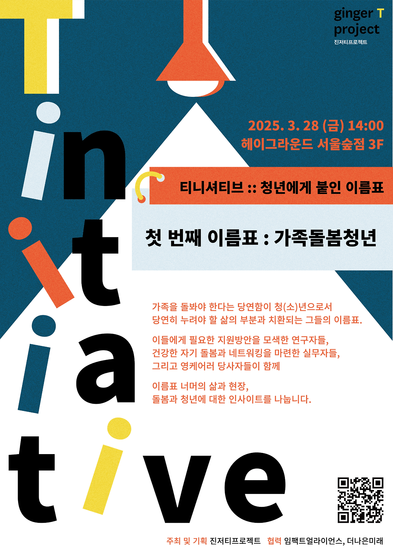티니셔티브는 진저티가 목격한 사회 변화와 현장의 지식을 공유하며, 소셜 섹터 관계자들과 함께 새로운 변화를 시작하는 자리인데요. 저희가 첫 주제로 ‘청년에게 붙인 이름표’를 기획하게 된 것은 내부적인 고민과 맞닿아 있습니다. 진저티는 최근 5년간 연구와 교육, 네트워크 등 다양한 방식으로 니트 청년, 자립준비청년, 가족돌봄청년을 만나왔습니다. 지난해 가족돌봄청년들까지 만나게 되면서 문득 “청년들을 둘러싼 문제는 중첩되고 또 심화되고 있는데, 무슨 무슨 청년이라고 이름표만 바꿔가며 돌려막기하고 있는 것은 아닌가?”라는 의문을 품게 되었습니다. 그래서 이름표 너머 청년들의 진짜 목소리, 삶의 현장을 나누며 어디서부터 어떻게 함께 이 실타래를 풀어갈 수 있을지 시작점이라도 만들어보자는 취지로 첫번째 티니셔티브를 기획하게 되었어요. 그렇지만 저희 혼자서는 이 변화를 만들 수 없기에 ‘함께’ 만드는 변화의 시작에 마음 모아주실 분들을 초대하게 되었습니다 :)