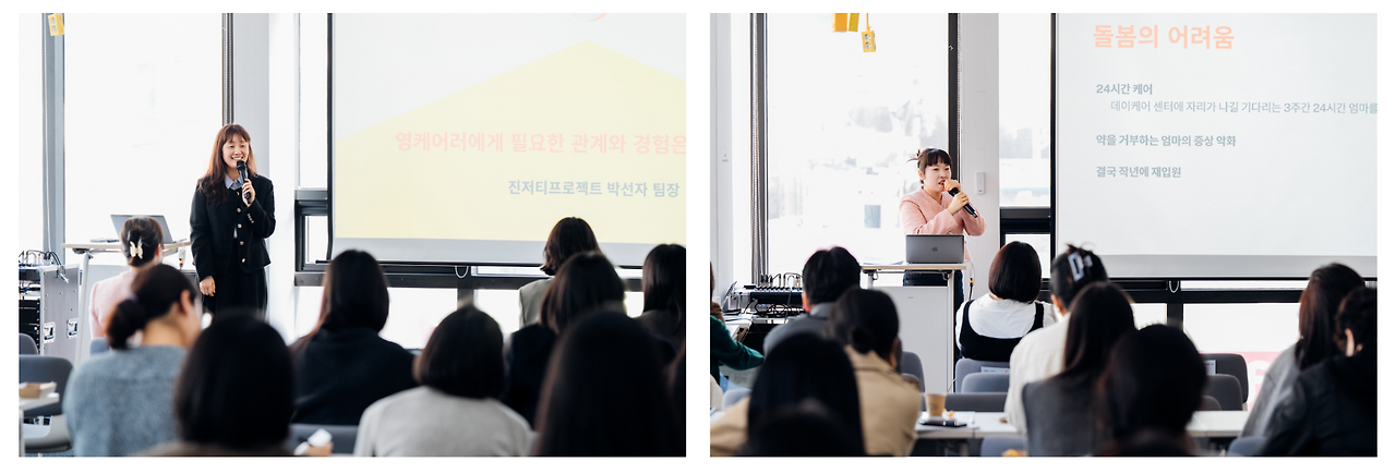 첫번째 이름표는 '영케어러(가족돌봄청년)'인데요. 영케어러는 지난해 진저티가 연구와 커뮤니티로 가장 깊이 만났던 청년들입니다. 영케어러에게 관심갖고 계신 다양한 조직의 실무자분들이 함께해 주셨는데요, 과연 첫 번째 티니셔티브에는 어떤 이야기들이 담겼을까요? 영케어러의 맥락과 지원 방안을 모색한 연구자들부터 영케어러를 위한 커뮤니티를 조성한 현장의 실무자들, 그리고 당사자가 직접 전하는 영케어러의 진짜 목소리까지 그 날의 이야기를 함께 돌아 볼까요?