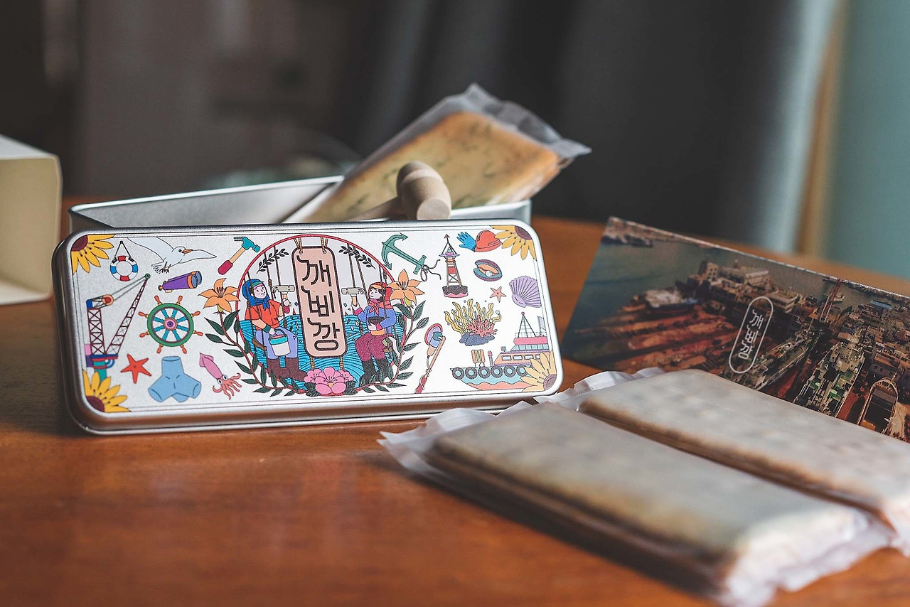 저는 그때 책방에서 손님들이 간단히 즐길 수 있는 음료와 음식을 담당했었어요. 원래 요리를 좋아하기도 해서. 그러던 중, 영도에는 깡깡이 마을이라는 곳에서 로컬 사업을 지원해준다는 공고를 보게 되었어요. 저희 크루는 그때 ‘깡깡이’에서 영감을 받아서 망치로 깨서 먹는 ‘깨삐깡'이라는 전병 과자를 만들었어요. 깡깡이 마을의 의미에 맞게끔. 왜냐하면 일본이나 한국의 다른 마을을 가면, 마을만의 과자가 있는데, 영도에는 그런 게 없었었거든요.