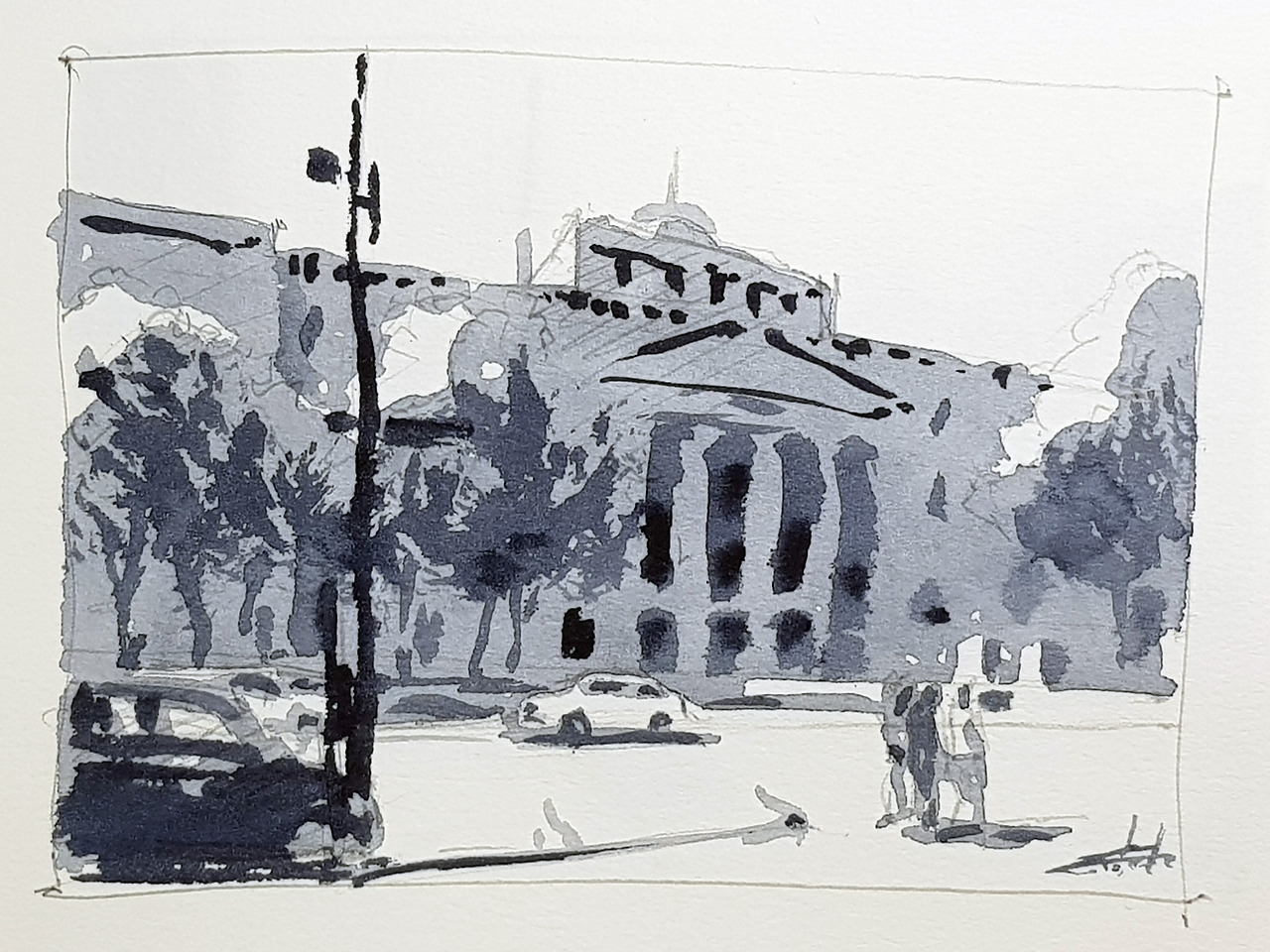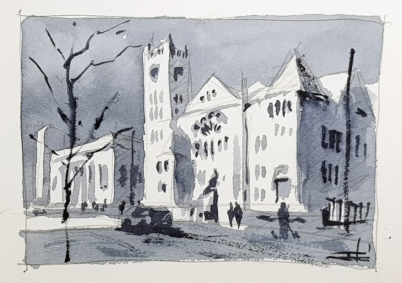 언젠가 그려보려고 찍었던 몬트리올 거리들을 썸네일 스케치로 그려 볼 것인데요 우선 첫 번째 장소입니다. 올드 몬트리올 지역에 있는 몬트리올 은행을 배경으로 한 거리 모습입니다.