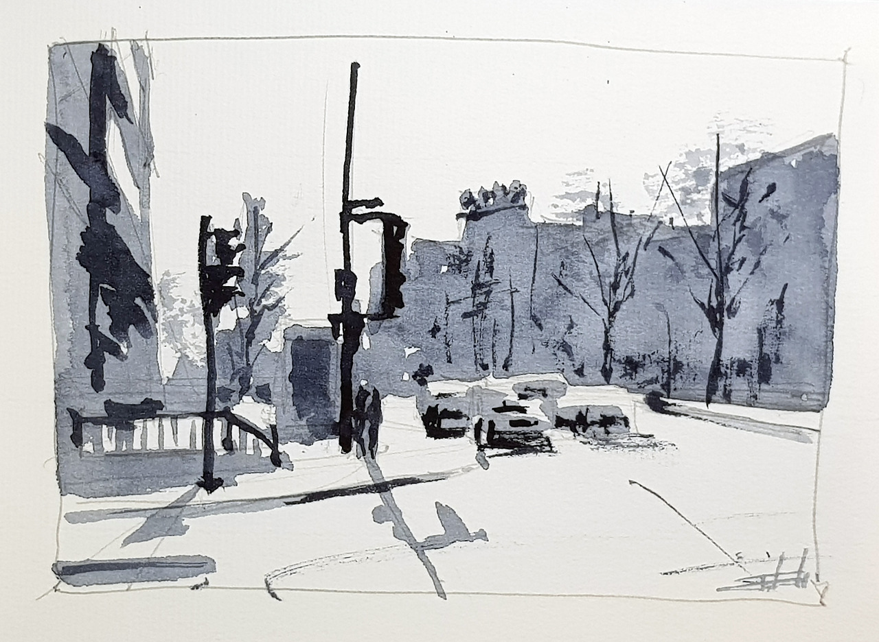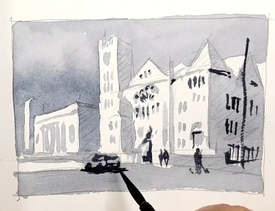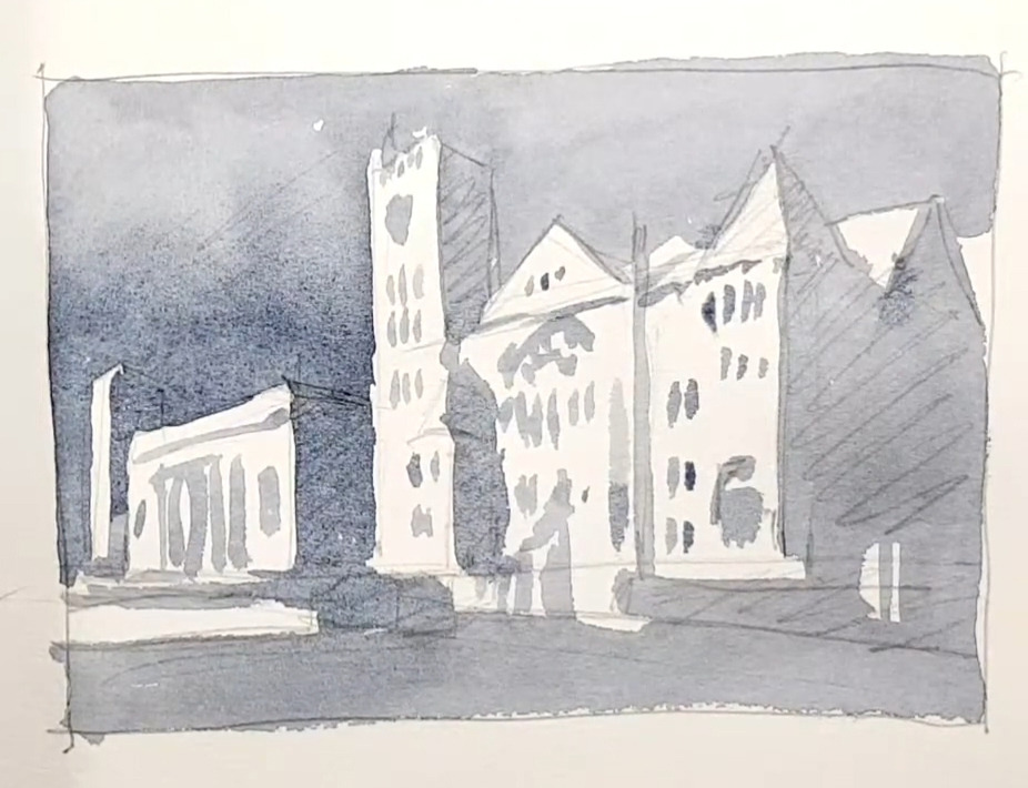 건물의 세로 라인들을 모두 지면에서 수직으로 변경합니다. 이번에는 하늘을 중간 명도로 포함합니다. 땅에도 많은 부분 어두운 그림자가 져서 이전 두 그림들과는 달리 중간 명도로 포함합니다.