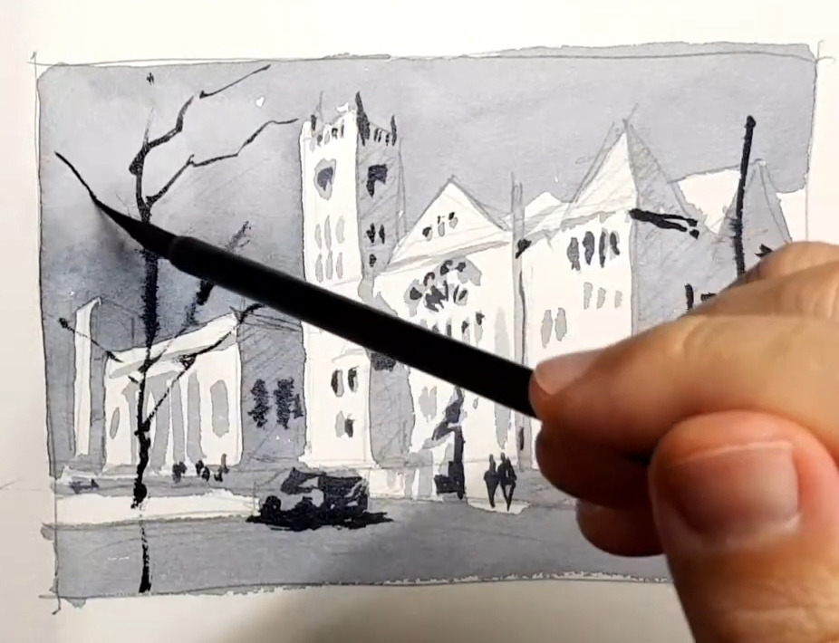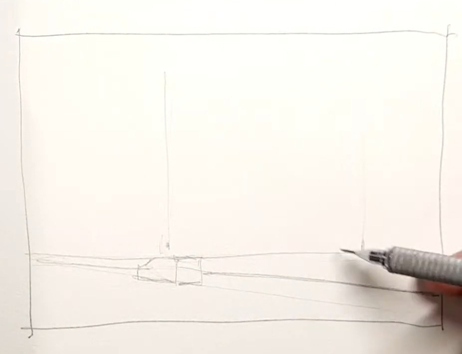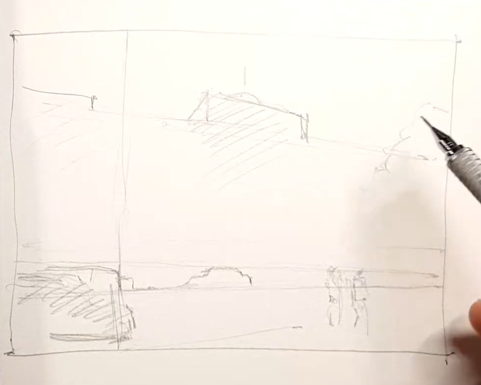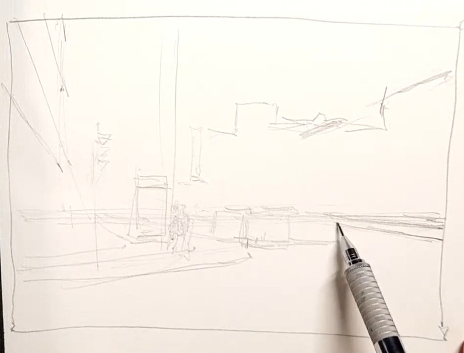 적절한 구도가 어떠할지를 생각하며 중간 명도 그룹의 실루엣 중심으로 스케치해줍니다. 눈높이 라인도 필요에 따라 수정해줍니다. 주요 구도의 장애요소들을 실제로 그림으로 그리기 전에 썸네일 스케치를 단계에서 발견 수정한다면 그 유익은 말로 다할 수 없을 것입니다.