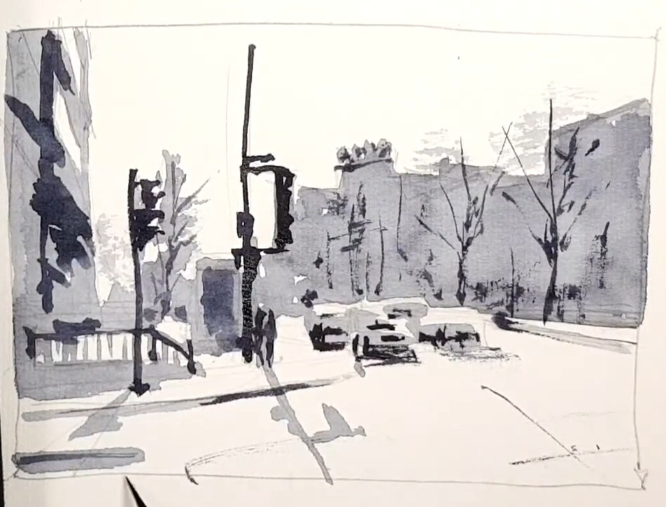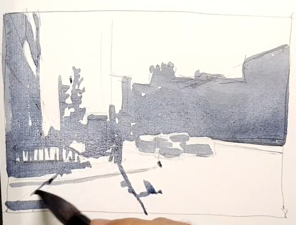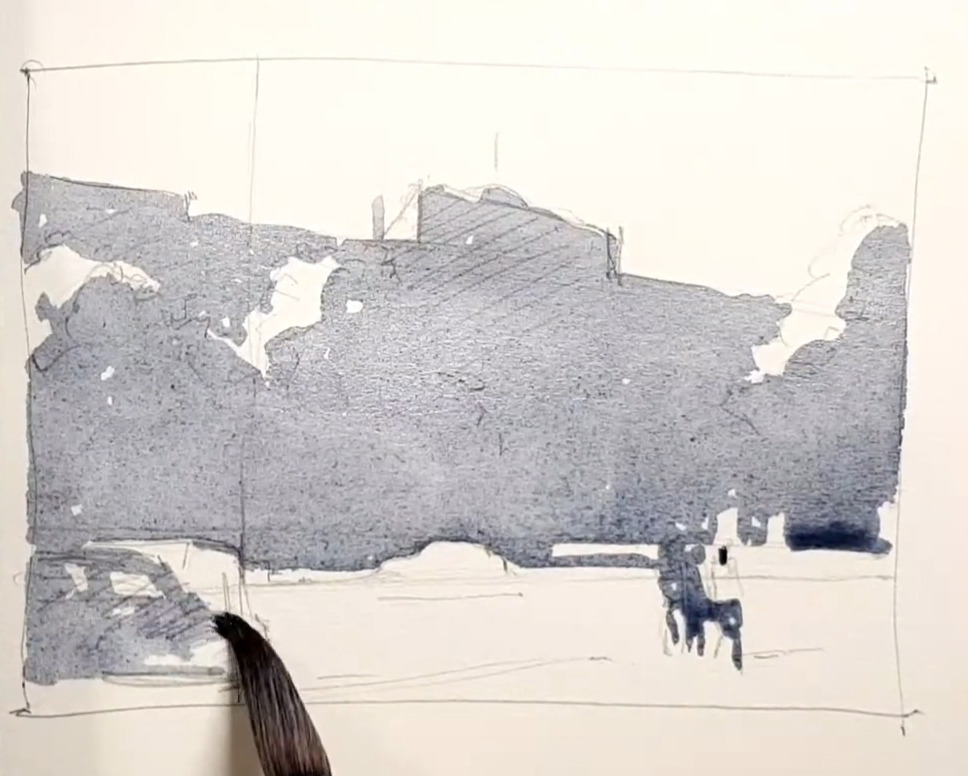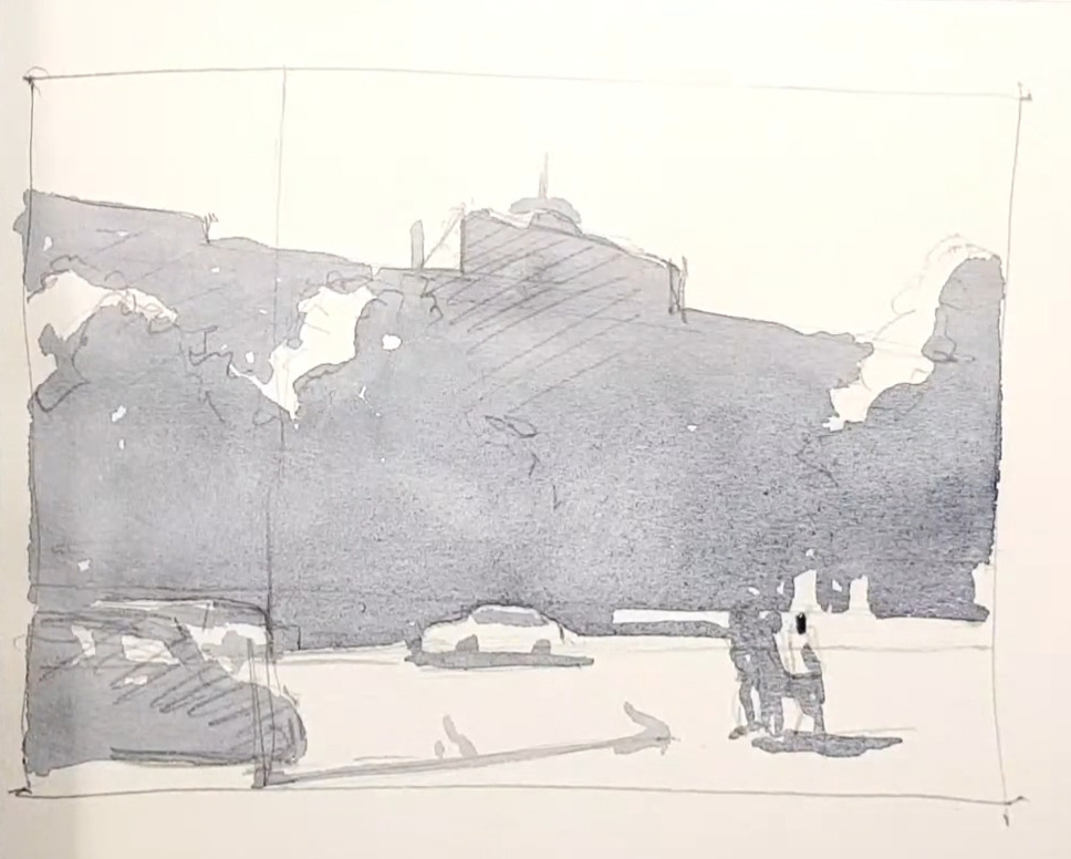 스케치는 최대한 단순하게 진행합니다. 명도 그룹 군으로 묶어 최대한 그 경계들만을 실루엣으로 표현하는 것으로 족합니다. 이 단계에서 구도적으로 이 장면을 그림으로 그리는 것이 적합한 지를 테스트 해볼 수 있습니다. 또한 주요 포컬 포인트가 무엇인지도 유념하는 것이 좋습니다.