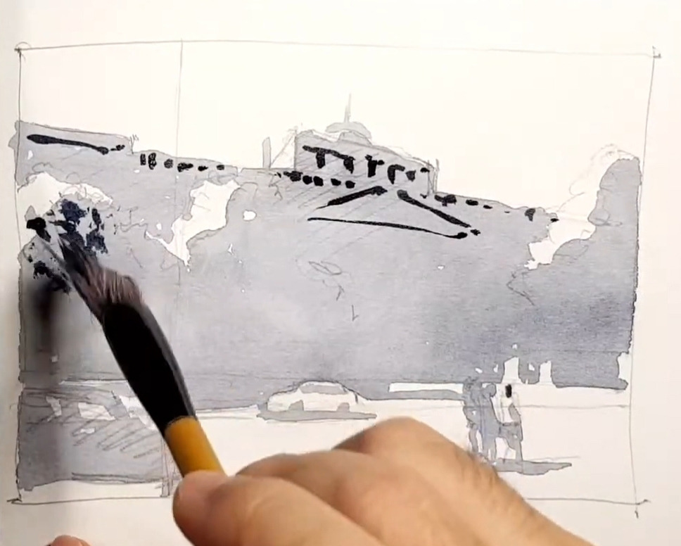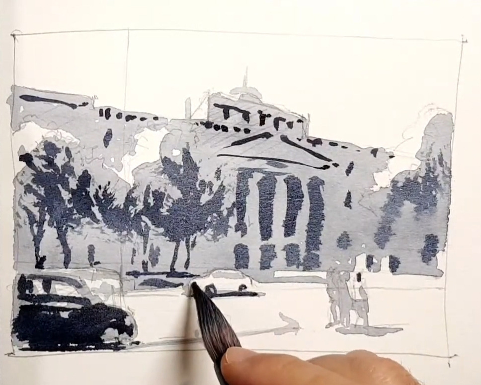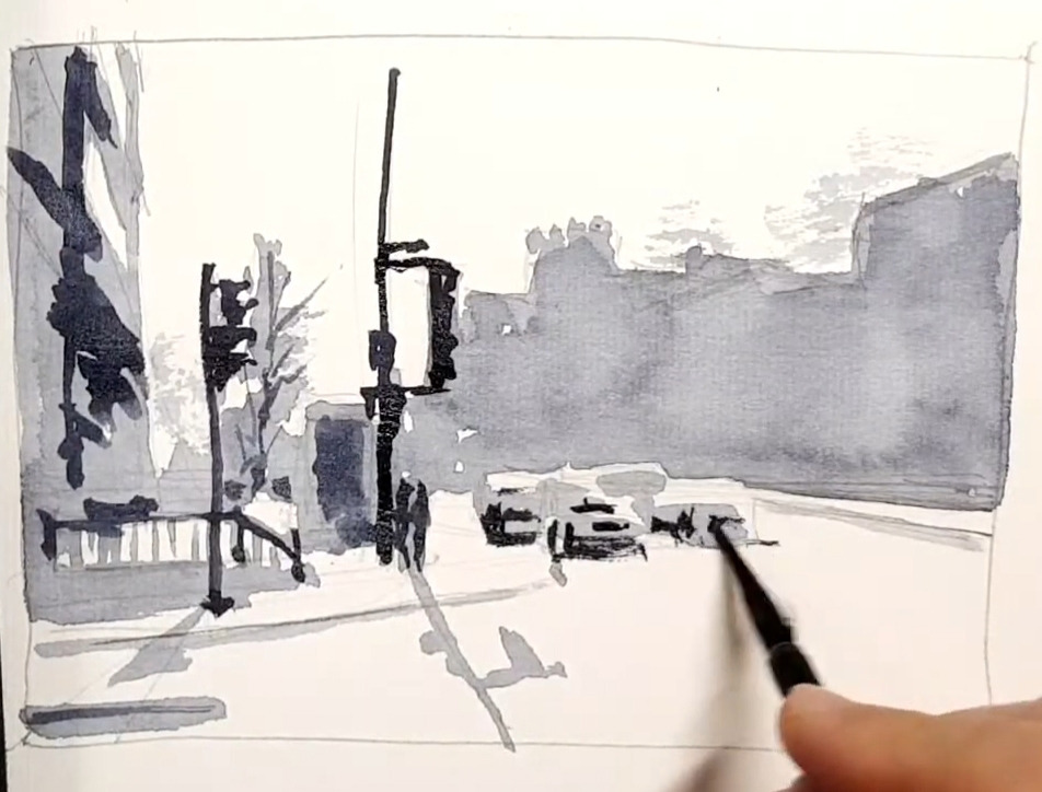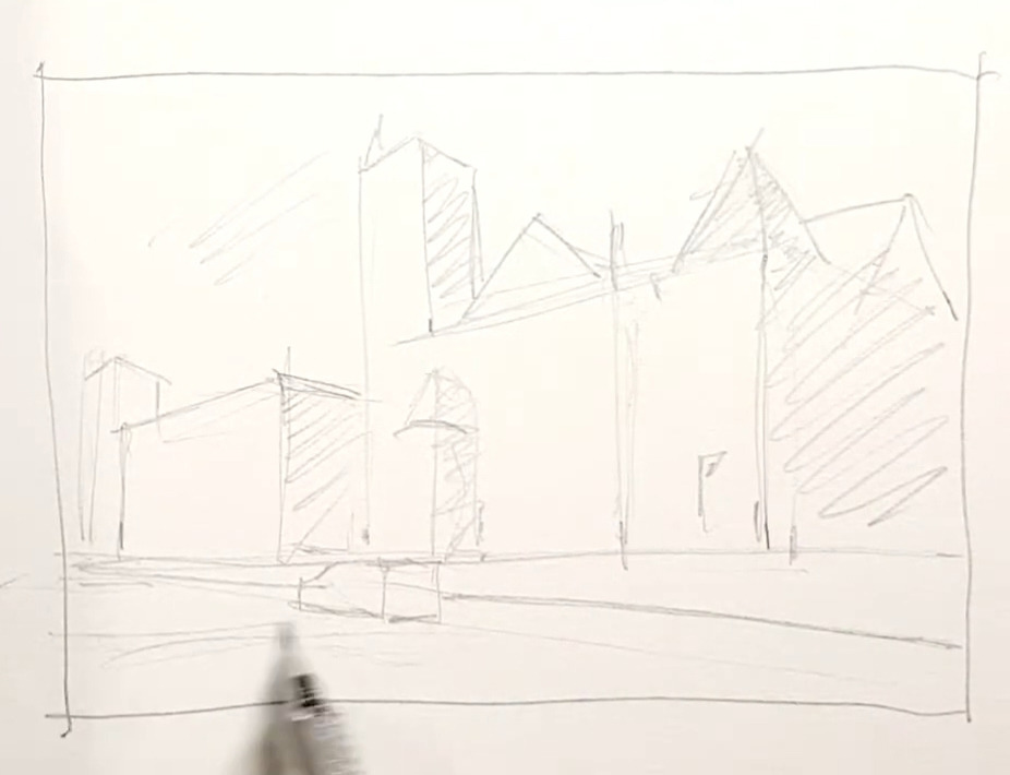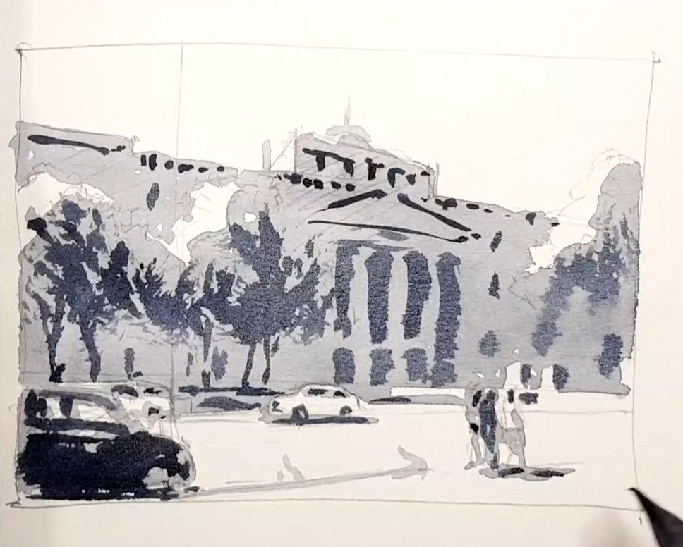 스케치는 최대한 단순하게 진행합니다. 명도 그룹 군으로 묶어 최대한 그 경계들만을 실루엣으로 표현하는 것으로 족합니다. 이 단계에서 구도적으로 이 장면을 그림으로 그리는 것이 적합한 지를 테스트 해볼 수 있습니다. 또한 주요 포컬 포인트가 무엇인지도 유념하는 것이 좋습니다.