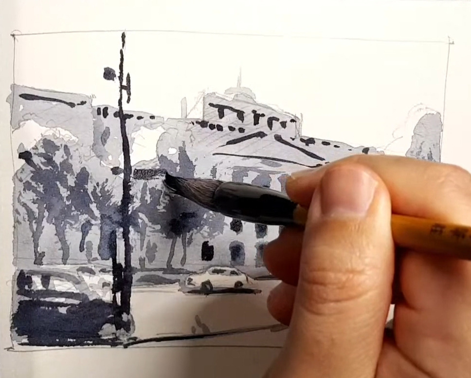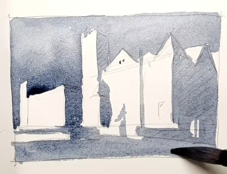 밝은 명도는 모두 칠하지 않은 상태로 둡니다. 하늘의 경우는 보통 밝은 명도일 경우가 많아 채색을 하지 않고 화이트 그대로 두도록 합니다. 만약 빛을 받는 건물의 명도가 하늘보다 확연히 밝아 명도 관계가 전환될 경우에는 하늘을 중간 명도에 포함하고 건물의 빛 받는 면을 칠하지 않습니다.