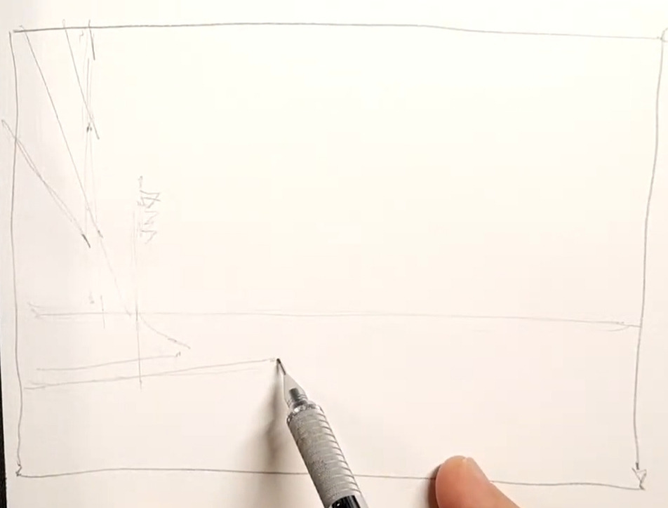 눈을 반쯤 감고 확인한 명도 관계를 기억하며 프레임을 먼저 잡은 후 눈높이를 잡아 줍니다. 사진을 보시면 제가 몬트리올 은행 건물의 살짝 측면을 바라보고 있는데 이럴 경우 건물의 모서리가 드러나며 2점 투시가 생기게 됩니다. 여기서 주의하실 것은 건물이 3점 투시로 그려지지 않도록 주의해야 하는 것인데요. 이전에 라인 투시에 대한 글에서 고개를 들어서 위를 본 경우가 아닌 이상 화면상의 건물은 3점 투시로 설정하지 않는 것이 좋다고 했었죠? 다만 요즘은 핸드폰 카메라의 기본 화각이 약간 광각으로 설정되어 3점 투시가 생기는 경우가 많습니다. 3점 투시로 그리는 것이 아니라면 건물의 세로라인들은 모두 지면에서 수직이 되어야 합니다. 이를 고려하며 눈높이 라인과 주요 투시 라인들을 잡아줍니다.