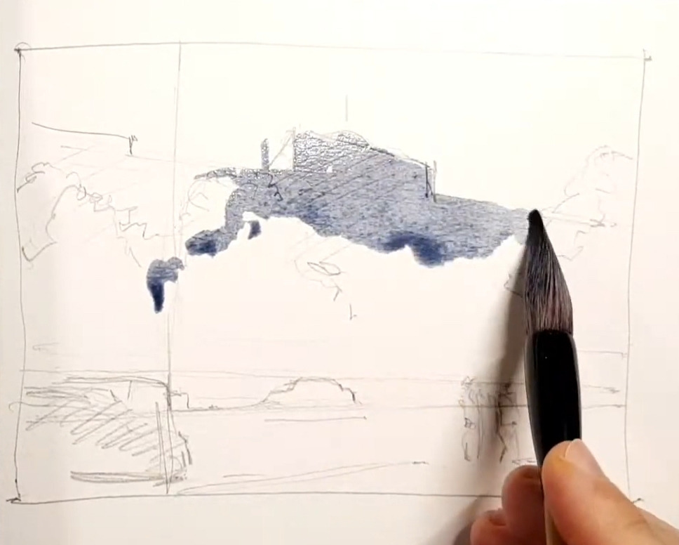 스케치를 완성한 후 어두운 단색 물감으로(저의 경우는 인디고 수채물감 한 색만을 사용하였습니다.) 모든 중간 명도들을 연결하며 칠해줍니다. 이때 중간 명도에 해당하는 물감물을 매우 많이 만들어야 마르지 않고 기분 좋게 채색이 가능합니다. 이를 통해서 실제로 그림을 그릴 때도 중간 명도의 물감물을 얼마나 많이 만들어야 하는지를 깨닫게 됩니다. 물감물을 다 쓰지 못하는 한이 있더라도 전체 그림에서 그 색에 대한 면적을 다 칠하고도 약간 여유가 있을 정도로 물감물을 만드시는 것이 좋습니다. 모자라서 다시 만들게 될 경우 참 안타까운 상황이 많이 생기게 됩니다.