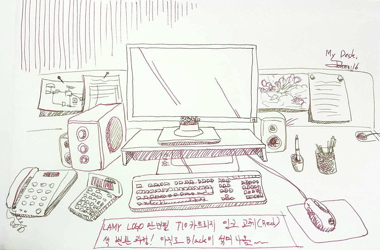 드디어 고대하던 스케치북이 도착했습니다. 첫 포장을 뜯는 순간 느꼈던 흥분과 설렘을 지금도 기억합니다. 며칠간 스케치북을 만지작 거리며 예전에 선물 받았던 LAMY Logo 만년필도 꺼내 봤습니다. 오랫동안 사용하지 않았었는데 써보니 오! 아직도 잉크가 남아 있더군요. 그러나 잉크 컬러가 레드라서 스케치북의 첫 장에 그릴 그림의 색으로는 마음에 들지 않았습니다. 퇴근하는 길에 한가람 문구에 들려 이 만년필에 대응하는 블랙 잉크 카트리지를 구매한 후 교체했습니다. 드디어 준비는 끝났습니다. 뭘 그릴 지만 정하면 되었는데 개인 첫 스케치북의 첫 그림이다 보니 이를 고르는 것도 많은 시간이 걸리더라고요. 그러다가 지금 가장 시간을 많이 보내는 곳을 그리면 현재의 나를 표현하며 시작하는 것이 아닐까?라고 생각하게 되었고, 그런 대상으로 사무실 책상이 생각났습니다. 다음 날 출근하여 점심시간이 되기만을 기다렸습니다.