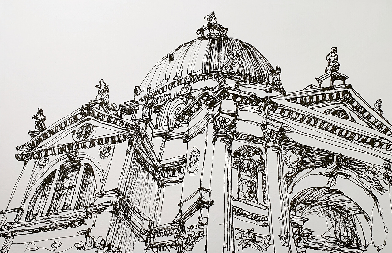 자신이 쓰는 선에 대해 자신감을 갖게 되면 어떤 선이 잘못 그어지는 것에 대한 부담이 확실히 줄고 선을 잘못 그었더라도 근처에 다른 선을 그어 대담하게 그림을 이어갈 수 있습니다. 위의 성당 드로잉 중 어떤 라인도 제도 라인과 같은 치밀함과 정확함이 있지는 않습니다. 직선도 없이 구불구불하죠. 그러나 그런 자유로운 라인들이 성당을 묘사하기에 부족하지 않습니다. 오히려 자신만의 '그림 지문'들이 가득 묻은 개성 있는 드로잉이 됩니다. 같은 이유로 직선인 건물을 그리시더라도 자를 쓰지 않으시는 것이 좋습니다. 지우개와 자는 멀리 치워두십시오.