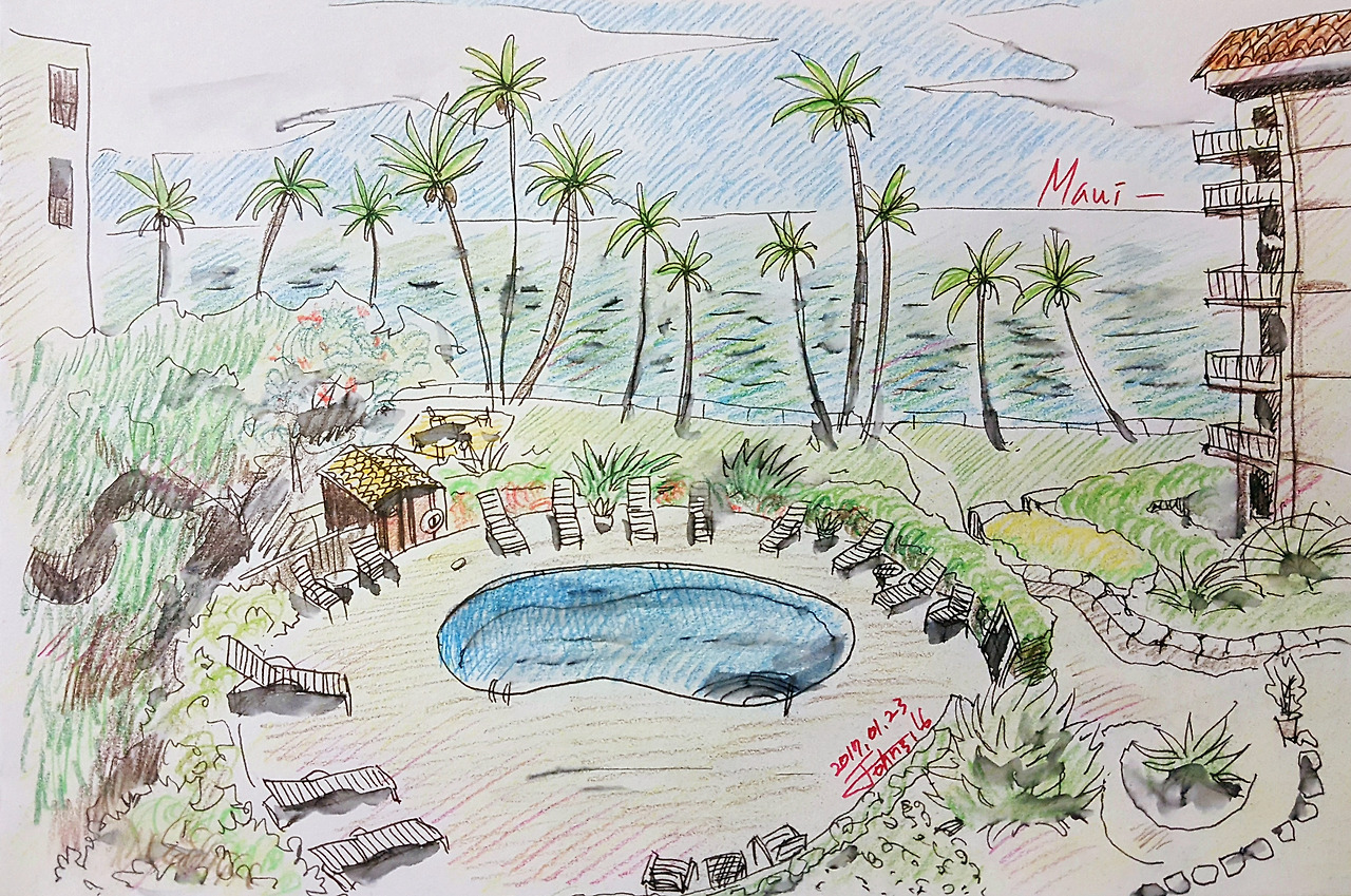 [마우이 해변 펜 드로잉 + 수채 색연필 채색 - 2017.01.23]