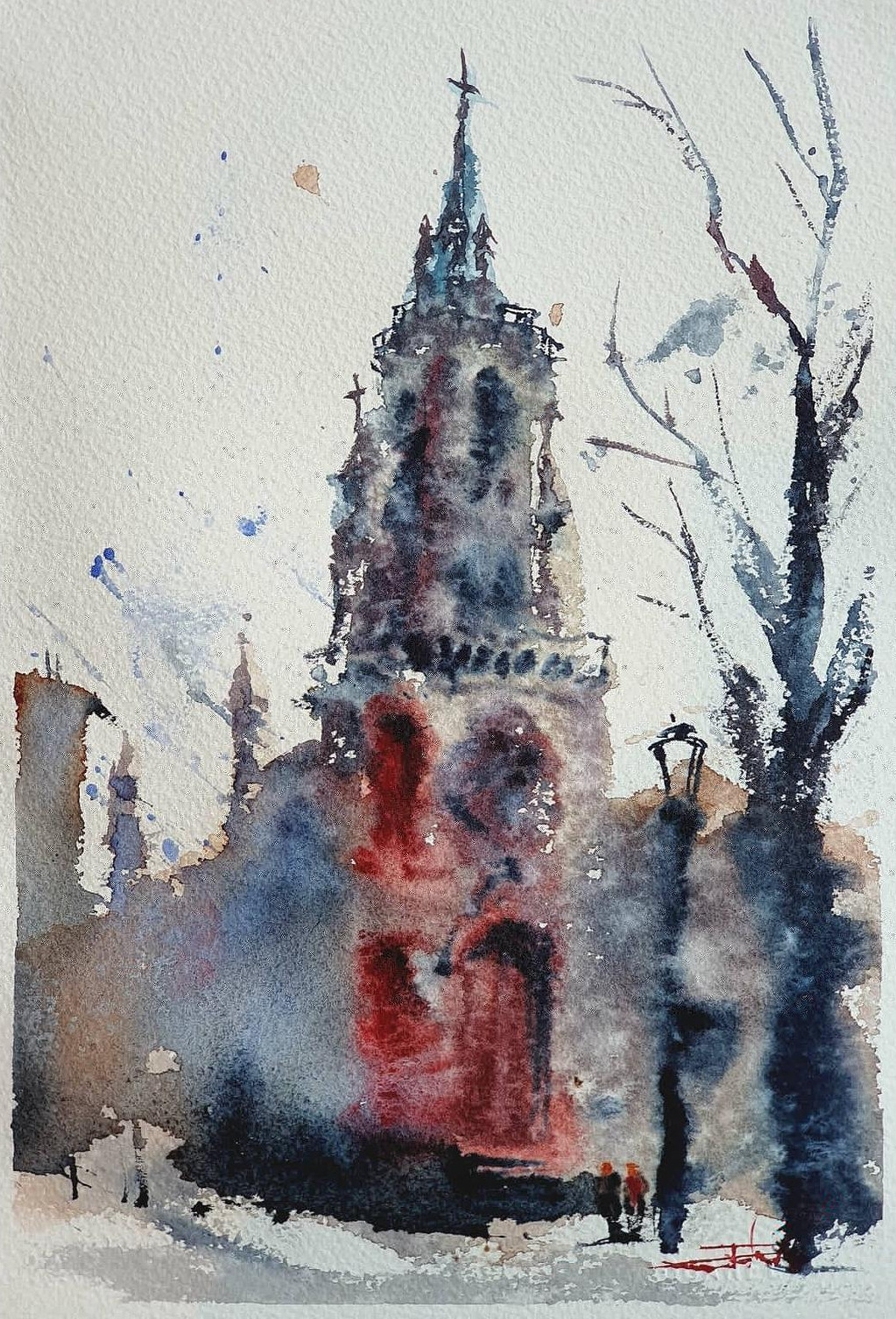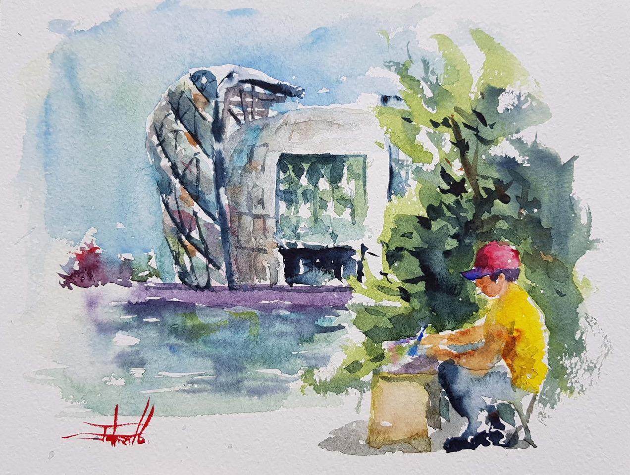 현장의 상황이 그대로 담기는 어반 스케치의 특징은 위의 그림에서도 보실 수 있는데 그리는 동안 비가 내려서 비를 맞으며 그렸더니 그림 전반에 물로 인한 특유의 무늬들이 생겨 났습니다. 게다가 그림을 바닥에 한 번 떨어뜨리게 되어 좌측 상단에 바닥에 쓸리며 물감이 밀린 자국이 생겼는데 이는 이 그림을 그릴 때의 고생에 대한 특별한 공감각적 흔적이 되어 매우 선명한 경험을 남겼습니다.