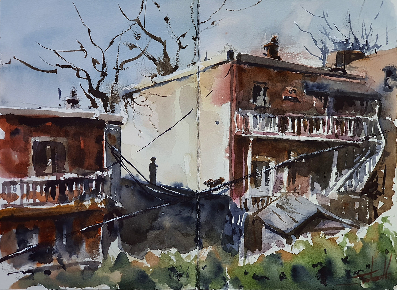 또한 매서운 추위의 몬트리올 겨울 어반 스케치 모임 중 용기를 내어 밖에서 그림을 그렸더니 물붓이 얼어버리고 그림에도 이 흔적이 남는 독특한 경험도 했었죠.