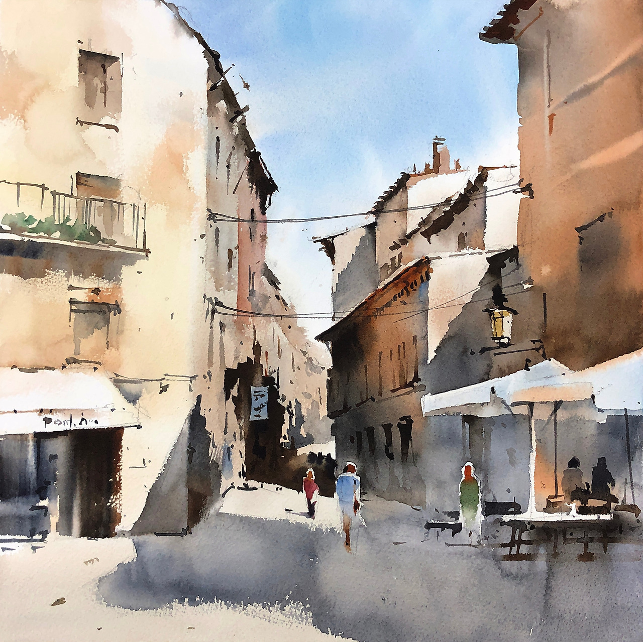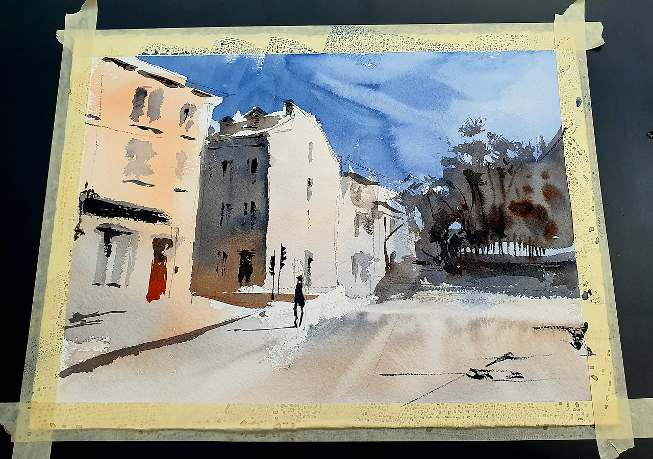 뒤통수를 한 대 맞은 거 같은 느낌이었습니다. '빛과 어두움에 집중할 때 이렇게까지 단순화할 수 있구나!' 하고 그림에 대한 어떤 사고 전환이 일어나는 순간이었습니다. 이 날 깨진 또 하나는 고정관념은 '아르쉬(Arches)' 수채 용지에 대한 부분이었습니다. 그간 채색하기만 하면 색이 날아가고 연해지는 것 때문에 이 종이에 수채화를 그리는 것에 참 어려움을 느껴 '기피 1호 종이'로 여기고 있었는데요. 선생님의 설명을 통해 오히려 종이가 좋아서 그런 현상이 나타난다는 것을 알게 되었습니다. 종이에 글루(glue)가 적게 포함되어 물과 물감의 입자들이 종이 깊숙이 침투해서 나타나는 현상인 것이었어요. 적절한 물과 물감을 사용할 때 아르쉬 종이에 그리는 수채화가 얼마나 아름다울 수 있는지 다른 종이와 비교해주신 것을 통해 확실히 이해할 수 있었습니다.
