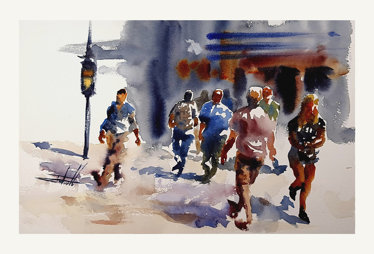 그림을 그릴 때 시선이 집중되는 '포컬 포인트(focal point)'의 중요성에 대해서 많은 아티스트분들이 강조를 하시는데 쉽게 이야기해서 '주인공이 주인공답게 집중되어야 한다.'고 생각하시면 쉬울 거 같습니다. 주인공과, 엑스트라. 주인공과 배경은 분명히 집중도에 있어서 차이가 나야 합니다. 위의 몬트리올 다운타운 사진 중 제가 주인공 그룹으로 본 것은 행인들입니다. 주인공 그룹에 집중하여 좀 극단적으로 표현을 해봤는데요. 일부 행인들 외에는 모두 엑스트라 및 배경으로 여기고 과감하게 단순화하였고 카메라의 위치 또한 원본보다 줌 인(zoom in) 혹은 크롭(crop)하여 표현하고자 하는 바를 좀 더 강조하였습니다. 신호등의 경우 영화감독의 의도대로 소품의 위치를 바꾸듯이 본래의 위치에서 좀 더 좌측 앞의 위치로 변경하였습니다.