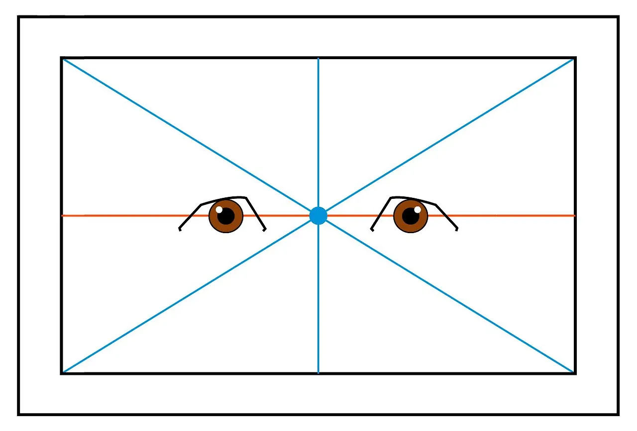 그런데 구도와 함께 매우 중요한 요소가 있습니다. 바로 카메라 렌즈의 초점 위치와 이로 인한 투시에 대한 부분입니다. 이를 그림 언어로 바꾸면 눈높이 초점 중심으로 투시가 생성된다는 표현으로 바꿀 수 있겠습니다. 눈높이는 그림을 그리는데, 특히 풍경을 그리는 데 있어서 놓쳐서는 안 되는 매우 중요한 부분입니다. 똑바로 서서 고개를 정면으로 한 후 사각 프레임을 눈 앞에 두었다고 가정해봅시다. 마치 아래와 같은 모습일 것입니다.