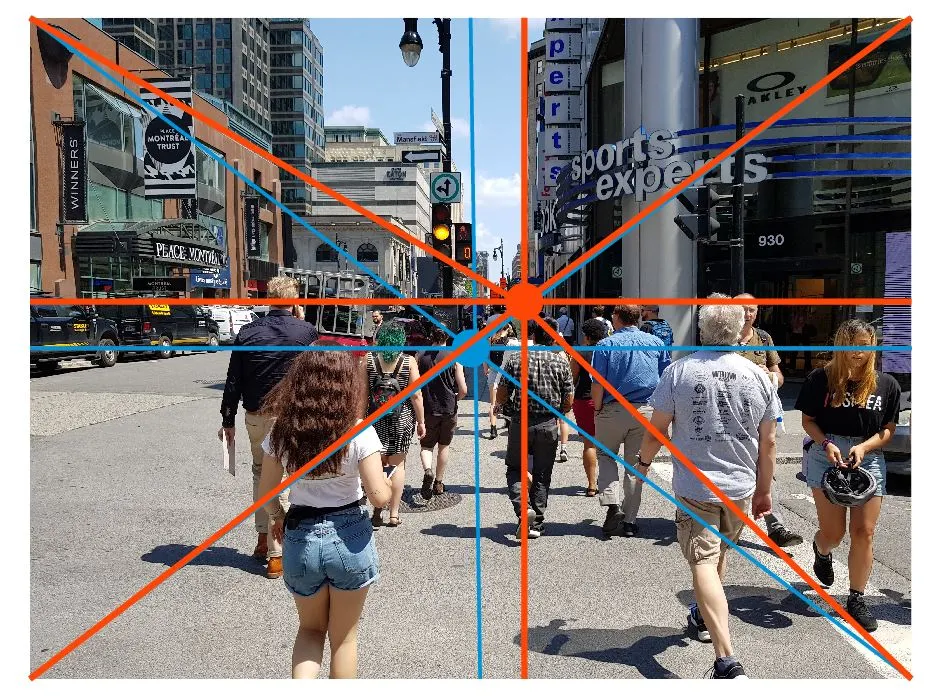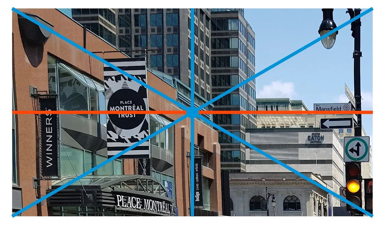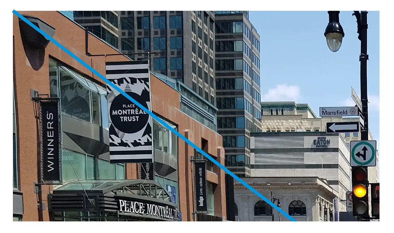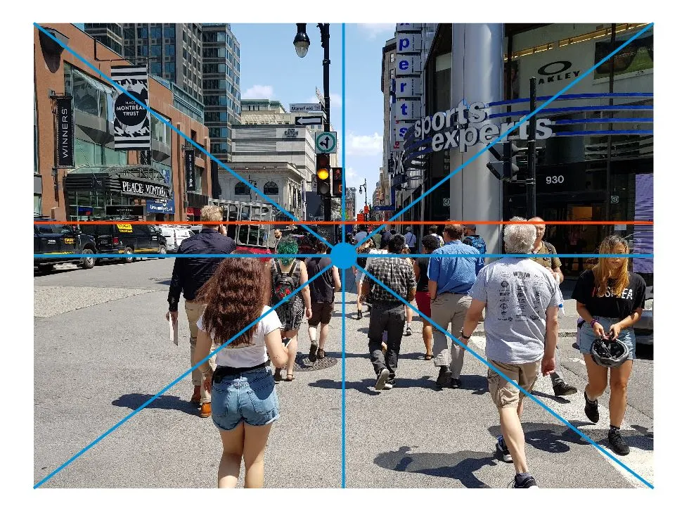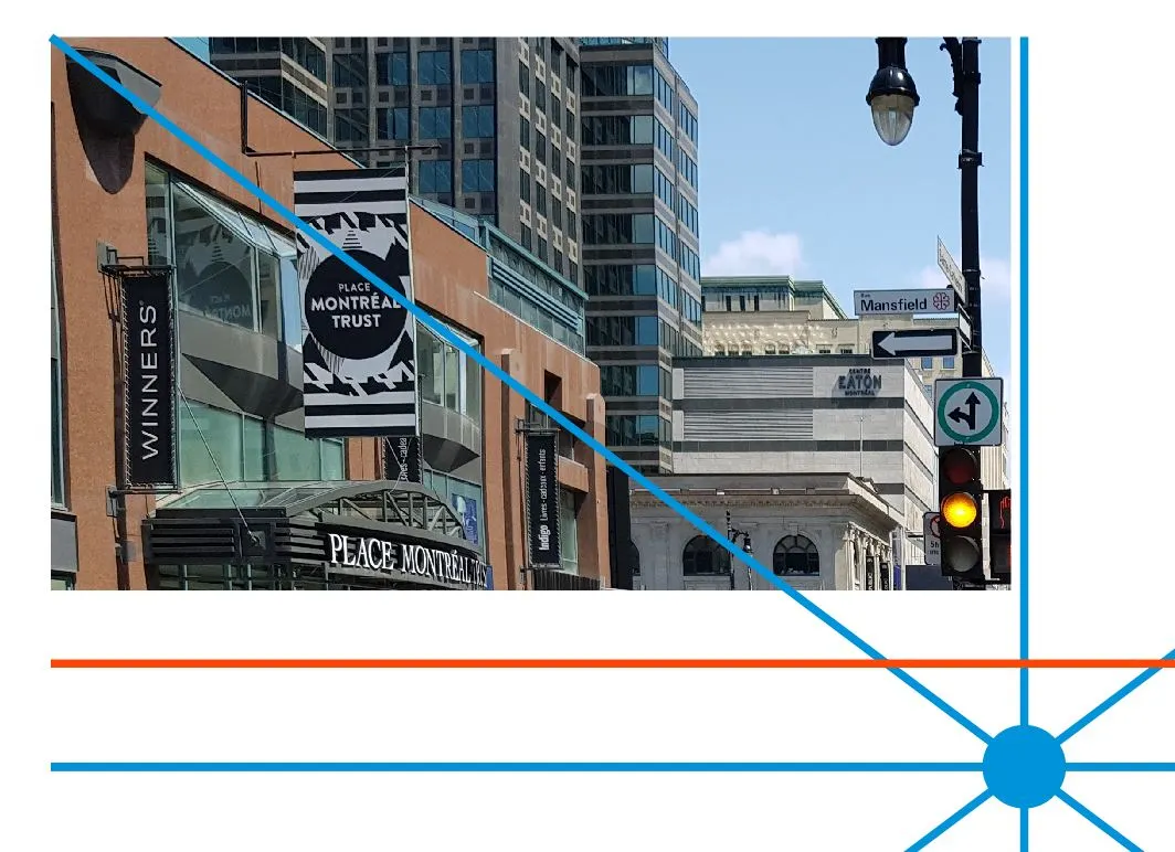 카메라로 찍은 사진 또한 우리의 눈높이에 따라 눈높이 라인이 생기고 카메라의 각도와 바라보는 방향 즉 시선에 따른 투시가 생깁니다. 이를 처음의 몬트리올 다운 타운 사진에 적용해보면 다음과 같습니다.
