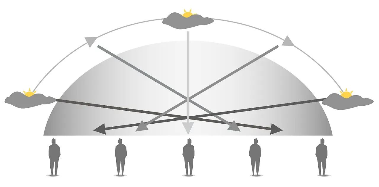 흐린 날의 경우 직접광인 태양빛이 구름에 의해 차단, 확산되어 전반적으로 하얀 확산광이 가득하게 됩니다. 이때 주 광원은 하늘입니다. 따뜻하고 차가운 색온도가 시간에 따라 느껴지지 않고 밝기 변화만 느껴진다고 생각하시면 됩니다. 그림자도 산란된 빛을 받게 되어 뚜렷하지 않고 태양의 위치에 따른 그림자의 길이 변화가 잘 나타나지 않습니다. (구름 층이 얇아 태양빛을 어느 정도 받는 경우는 맑은 날의 특징도 나타남) 이를 살펴보면 다음과 같습니다.