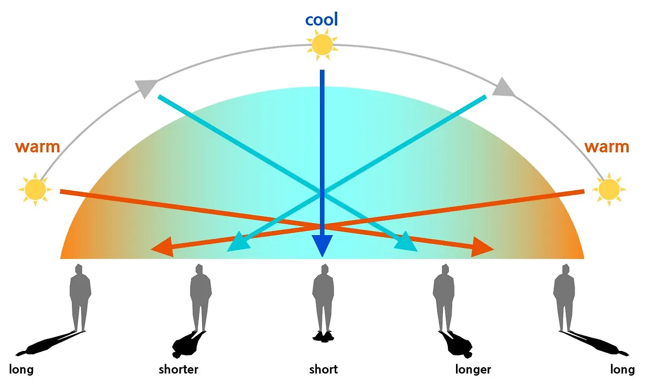 아침 : 주 광원인 태양의 위치가 낮고(땅에 있는 사람 기준), 빛은 따뜻한 색을 띤다.