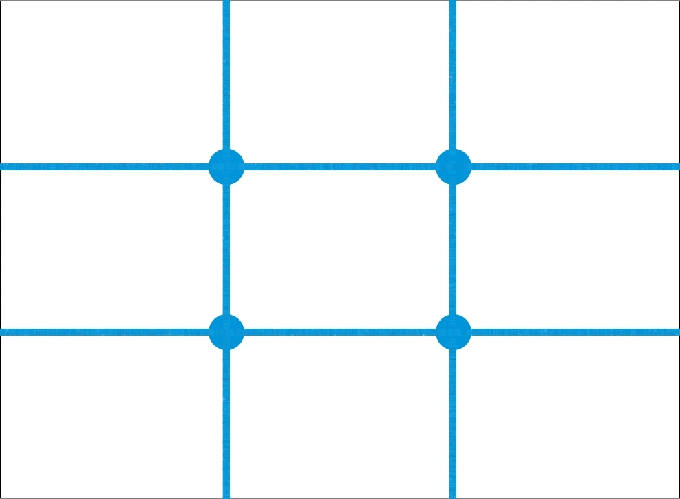 주인공도 정해졌고 장면의 상황에 맞는 조명도 정해졌는데 정작 주인공 반쪽만 모서리에 걸쳐 찍는다면 좀 이상하겠죠? 좋은 구도는 프레임 안에 표현하는 그림에도 참 중요한 요소입니다. 우리가 자주 접할 수 있는 좋은 구도는 9 분할 구도입니다. 화면을 가로 세로 각각 3 분할을 하고 이를 구도의 가이드로 삼는 것인데요. 분선들 위에 주요 배경의 포인트를 두고, 분선들의 접점에 주인공들을 배치하는 식으로 보시면 됩니다.
