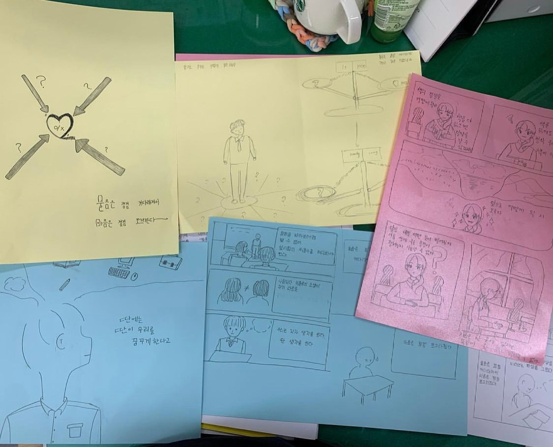 세상 모든 일이 마음의 일인데, 오은 시인님은 <<마음의 일>>이라는 시집을 두 가지 책으로 펴냈다. 한 권은 시집으로 한 권은 그림 시집으로. 만화가 재수와 시인 오은의 협업으로 이루어진 그림 시집은 시에 대한 접근을 쉽게 한다. 5월의 작가탐구반 동아리 시간에 오은 시인의 시를 읽고, 재수 작가님처럼 시를 만화로 표현해보자는 활동을 했었다. 그때 아이들이 고른 시의 구절 중 가장 인상적이었던 부분은