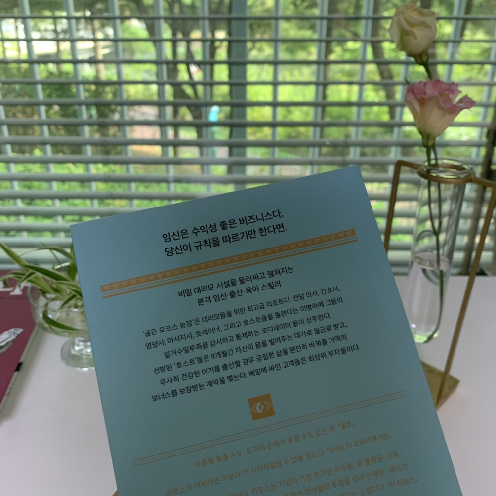 민트색 바탕에 흰색 건물 안 창가에는 임신한 여성의 실루엣이 금박으로 그려져 있는 이 고급스럽고 예쁜 표지 안에는 여성의 임신을 사업으로 일구는 놀라운 이야기가 담겼다. 등장하는 인물들의 면면도 다양해서 인물들 내에서 인종과 계급이 다 다른 여성들이 이야기를 굴린다. 사업을 기획하고 꾸려나가는 중국계 미국인 메이, 필리핀에서 이주해 와 미국인 남편과 헤어지고 갓 태어난 아기를 홀로 키우려 전전긍긍하는 제인, 그런 제인에게 일자리를 제안하는 부유한 가정의 신생아 보모로 일해온 아테, 부모로부터 물려받는 거 말고 자신이 직접 자기 삶을 일구고 싶어 대리모가 된 레이건 등. 이들이 '골든 오크스'라는 대리모 사업 안에서 저마다 자기 삶을 치열하게 살아가는 것이다.