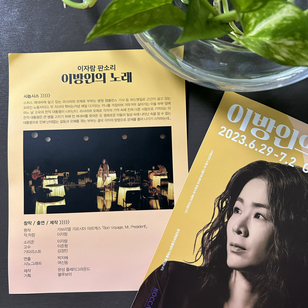 이자람의 <이방인의 노래>를 친정부모님과 우리 가족 삼대가 함께 감상했다. 나로서는 옛 생각을 떠올려 준비한 공연이었다. 무슨 말인고 하니, 예전에 그러니까 내가 어린이이던 옛날에 아빠가 아는 분께 예솔이와 그 아버지 사인이 있는 레코드 판을 받아온 적이 있다. <내 이름> 노래는 ‘예솔아~, 할아버지께서 부르셔. 네~하고 달려가면. 너 말고 네 아범.’하던 노래이다. 그 음반을 나는 즐겨 들었더랬다. ‘갓이오, 가시오’하던 말놀이가 담긴 이야기 같은 노래도 나오고 전래동요도 나오던 음반이었다. 그 예솔이가 이자람이라는 아티스트라는 걸 나는 ‘책읽아웃’에서 알았다. <오늘도 자람>이라는 책에 관한 얘기여서 팟캐스트를 듣고 책을 읽고, 그 내용 그러니까 그가 살아가는 태도가 너무 멋있어서 반해버렸다. 작년에 대전 예술의 전당에서 하는 야외공연을 보고 이 멋진 걸 공짜로 보다니 안 될 말이다 생각하며 감탄을 했다. 친구와 뮤지컬 <서편제>를 보면서 또 감동하고 드디어 그의 작창 판소리를 예매한 것이다. 이 좋은 걸 엄마, 아빠와 같이 봐야겠다 생각하고 여섯 장을 예매했다.