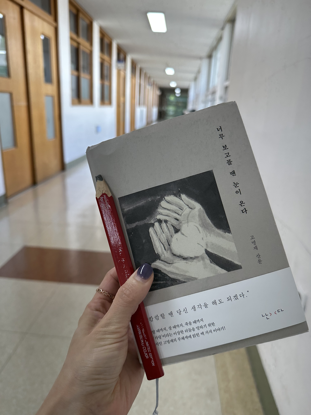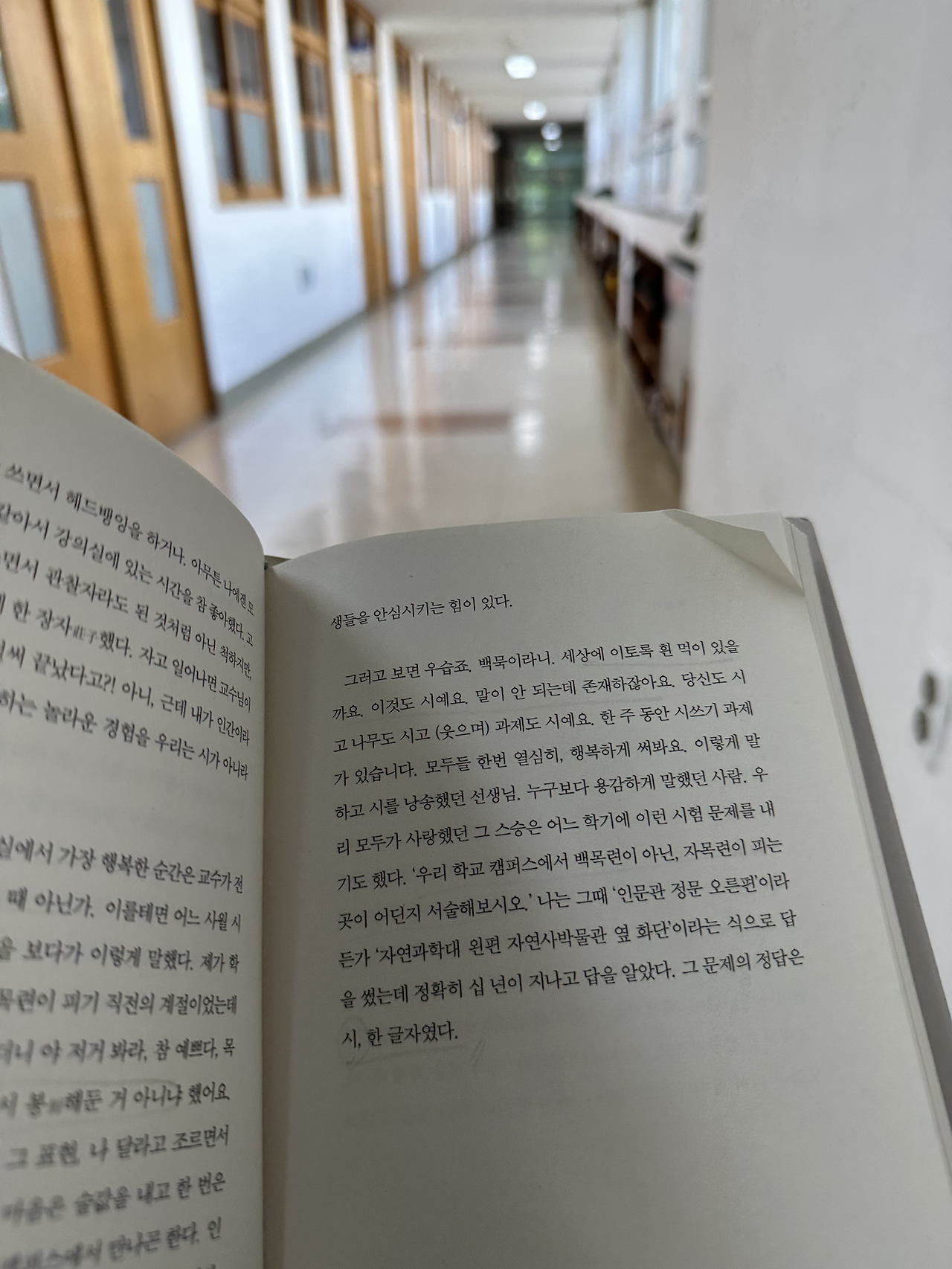 이런 생각을 오늘 시험감독을 하면서 했다. 교실 안에서는 학생들이 시험 문제와 씨름하고 있을 텐데, 그 사투가 보이지 않는 텅 빈 복도에서 책 하나를 껴안고 복도 감독을 했던 것이다. 고명재 시인의 책은 나를 시심에 푹 젖게 했다. 저 창문 너머에는 초록색 나뭇잎이 반짝이고 열린 창문 사이로는 시원한 가을바람이 불어오며 시인의 글은 때로 내 눈가를 젖게 했다. 시험 시간 이 고요한 순간을 만끽하는 것 또한 내게는 시.