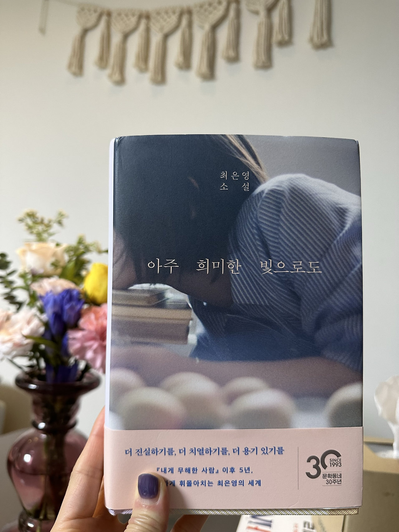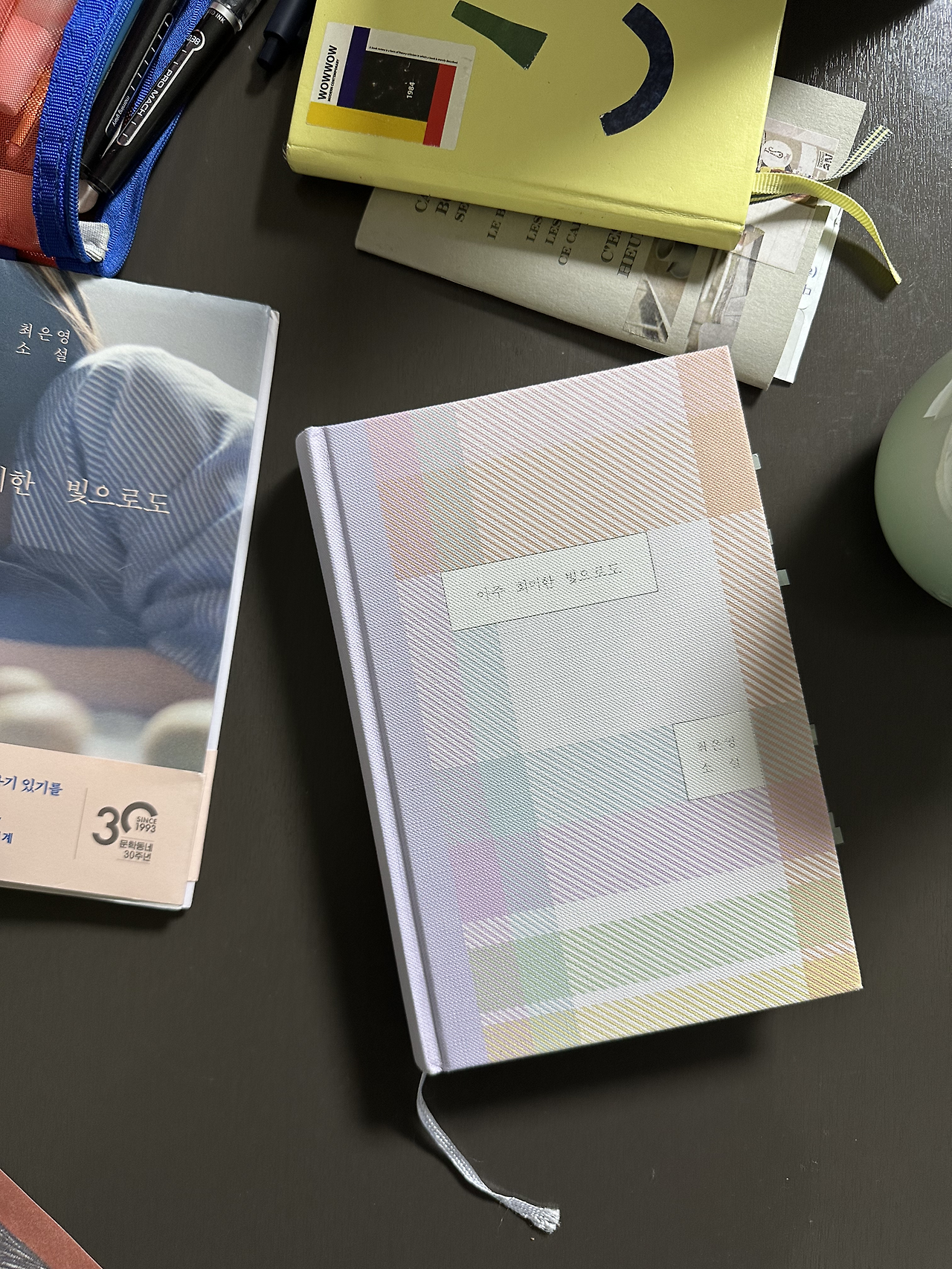 내가 고른 소설은 최은영 작가님의 <일 년>으로 <<아주 희미한 빛으로도>>라는 단편집에 있다. 사진으로 된 표지가 정말 예쁜데, 초판본에 한해 양장으로 된 책의 속표지는 은은한 파스텔톤의 체크무늬로 볼 때마다 감탄한다. 그 부드럽고 섬세한 결이 소설 속 은은하고 다정한 정서와 꼭 닮았다.